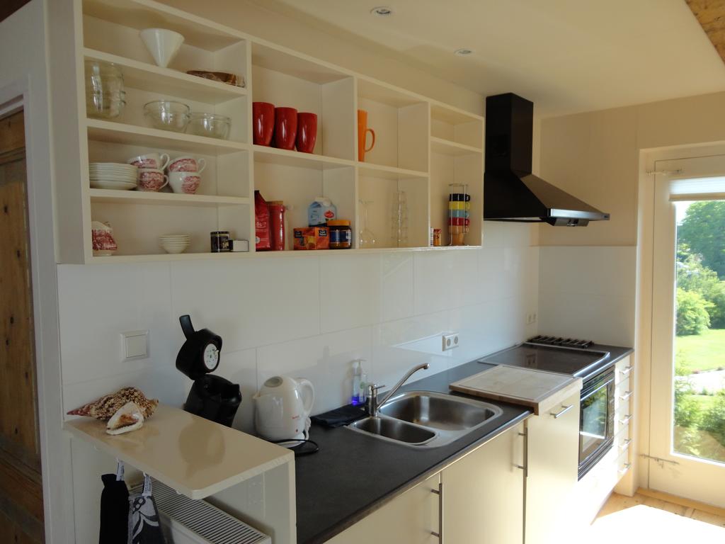 De (open) keuken heeft een koelkast, elektrisch fornuis met magnetronoven en afwasmachine. Via de schuifpui komt uit op het balkon grote balkon van 12m2.