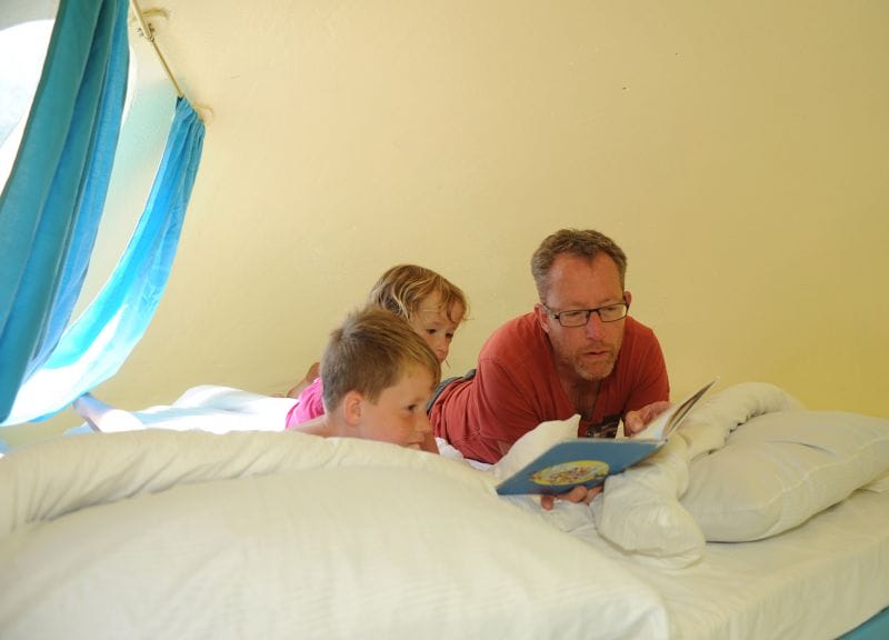 De ronde vormen zijn weliswaar niet heel groot, maar wel heel knus en speciaal. In het DrakenEi vindt u één groot bed (2x2m) in de vorm van een ei waar u met twee volwassenen en twee (kleine) kinderen in kunt overnachten.