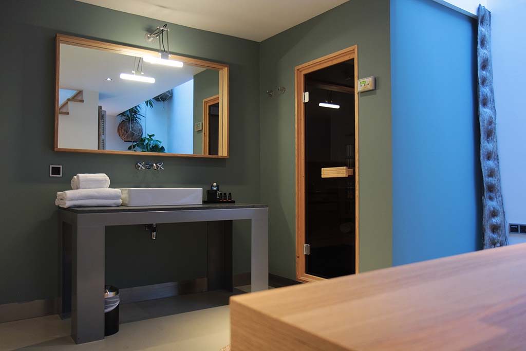 Ook de badkamer is bijzonder ingericht. Er is overal gelet op design. In de badkamer vind u uw eigen badjas en er is een toilet, föhn en designdouche (regendouche).