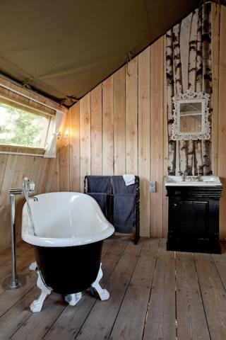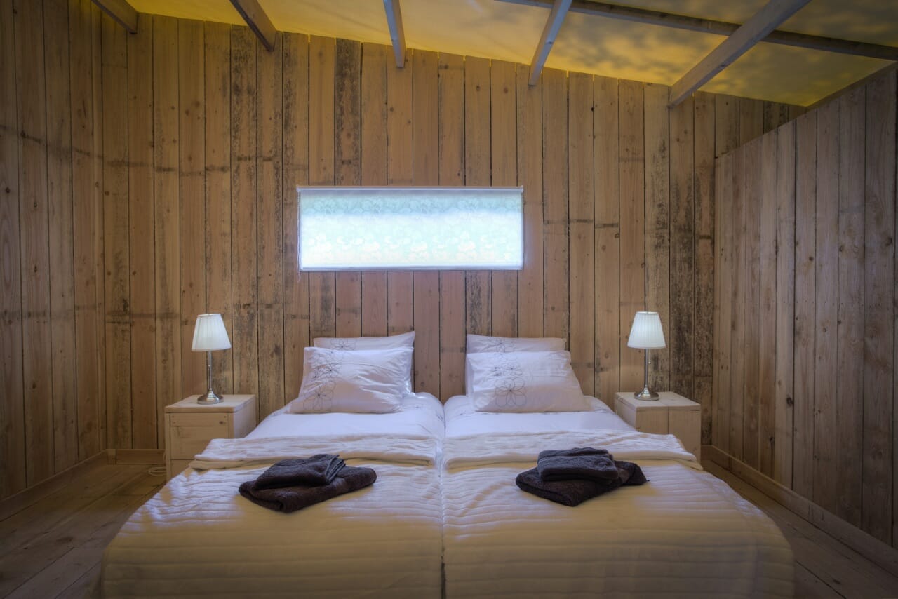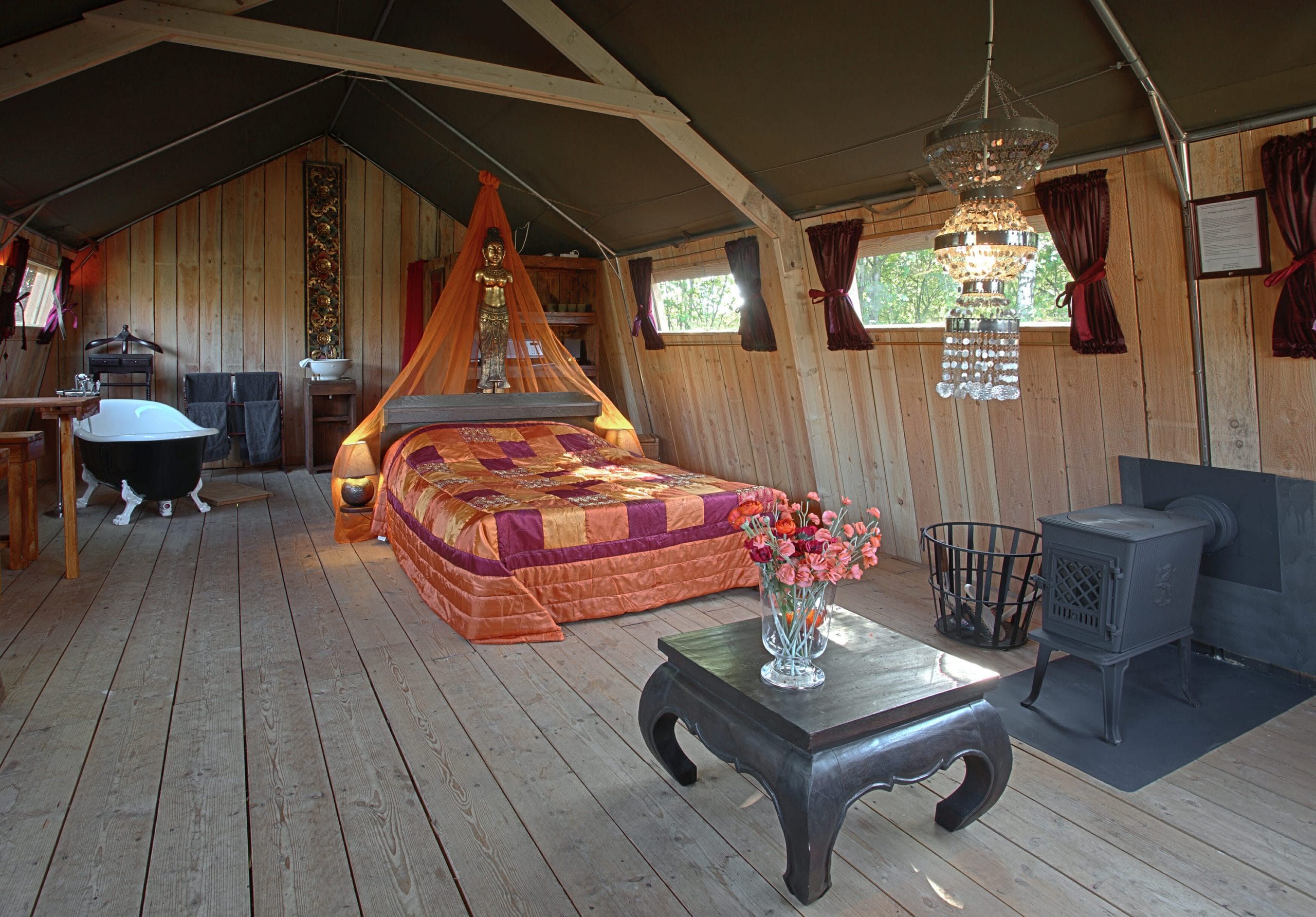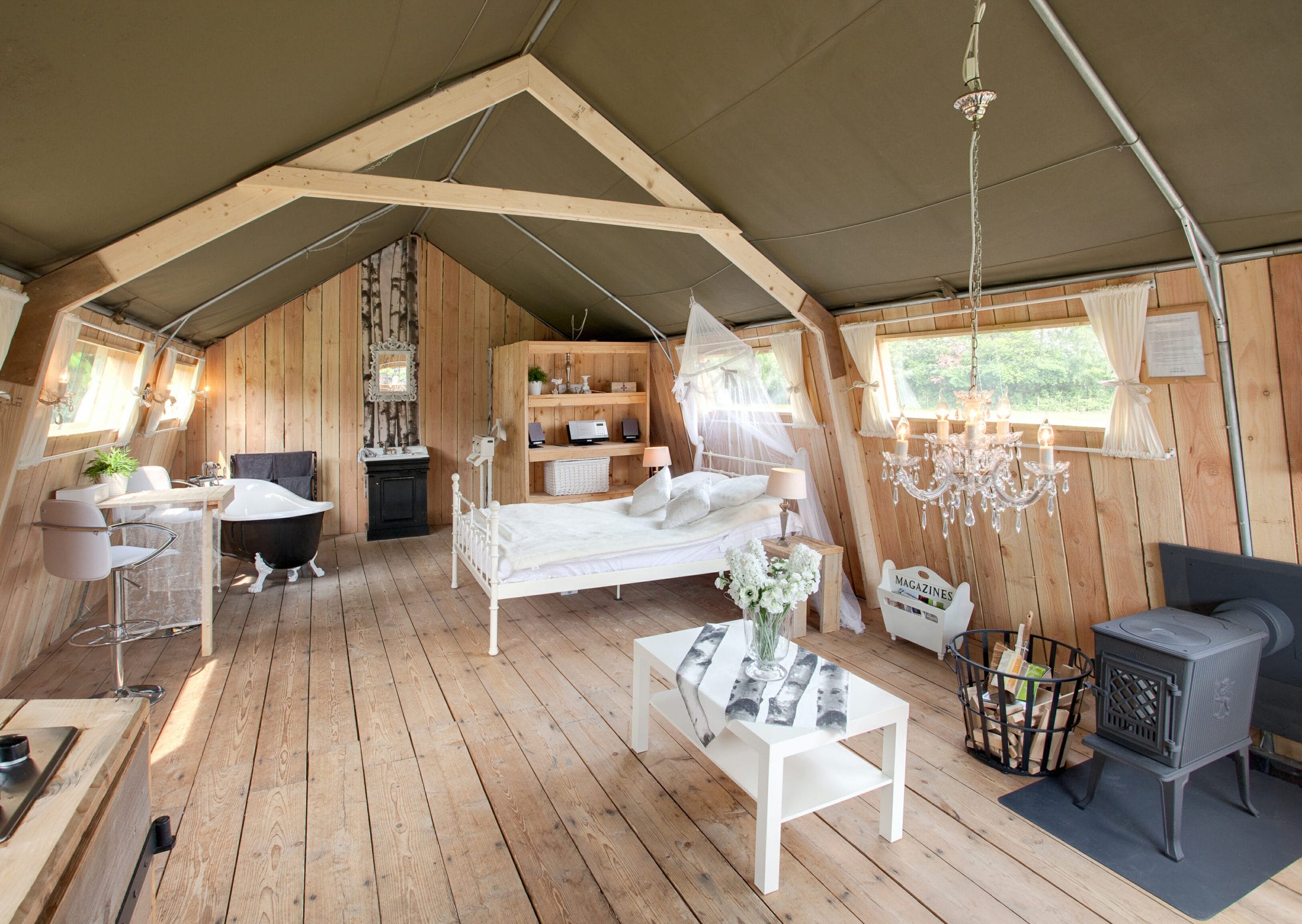 Dit zijn grote en zeer luxe canvas bungalowtenten. De wanden zijn van hout en de lodge bevat een schitterende houtkachel die zorgt voor natuurlijk warmte, gezelligheid en een aangename sfeer. Ook het plafond wat ook uit tentdoek bestaat is zeker uniek te noemen.