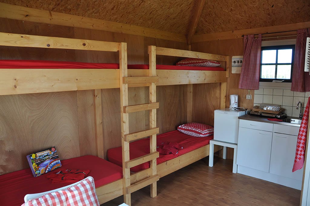 De hutten zijn comfortabel en compleet ingericht. We kunnen u geruststellen, de balen stro en hooi hebben we vervangen door een lekker dik matras. Een toilet is in de hut aanwezig en douchefaciliteit vindt u elders op de boerderij. U boekt al een hut vanaf € 45,- per nacht voor vier personen.