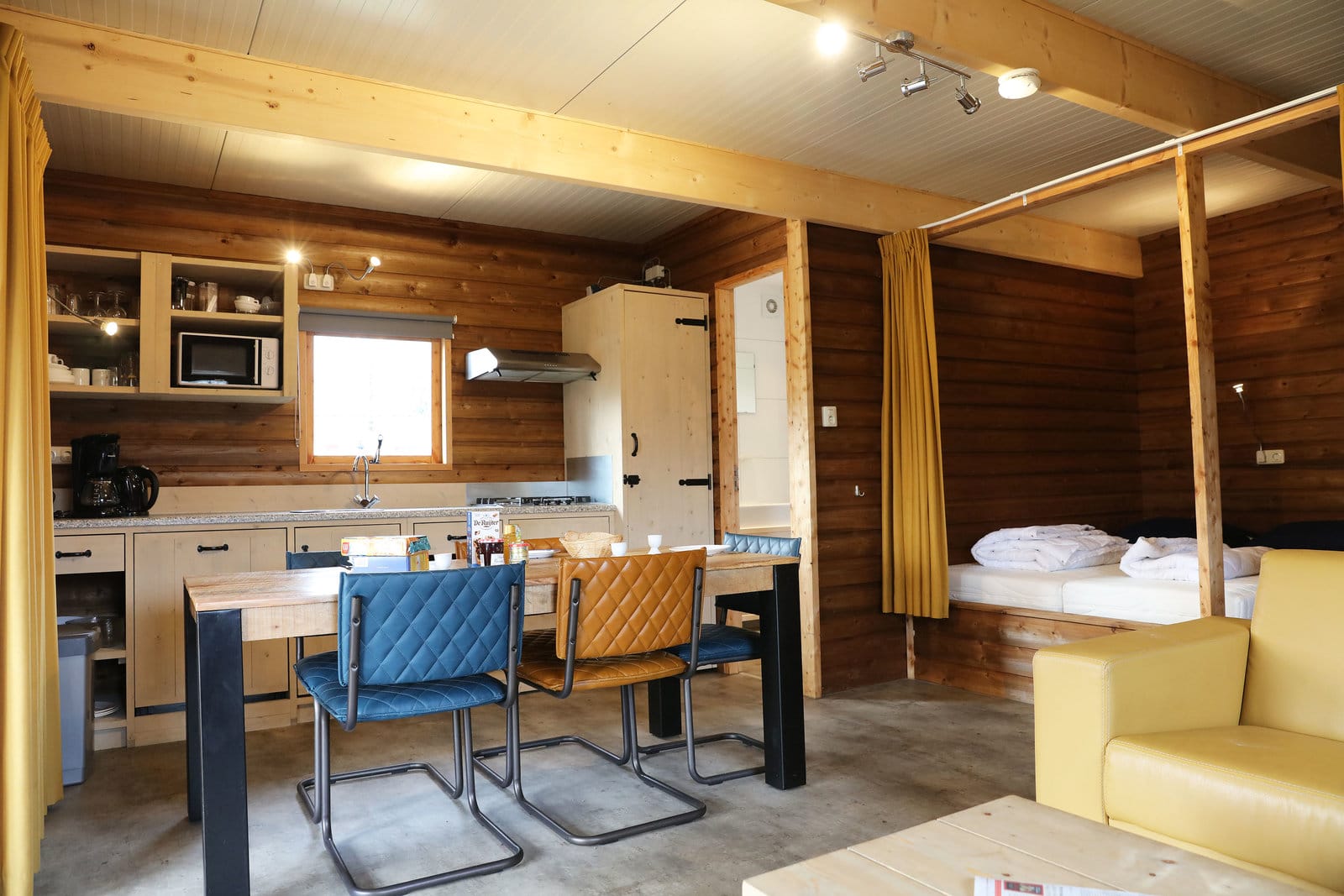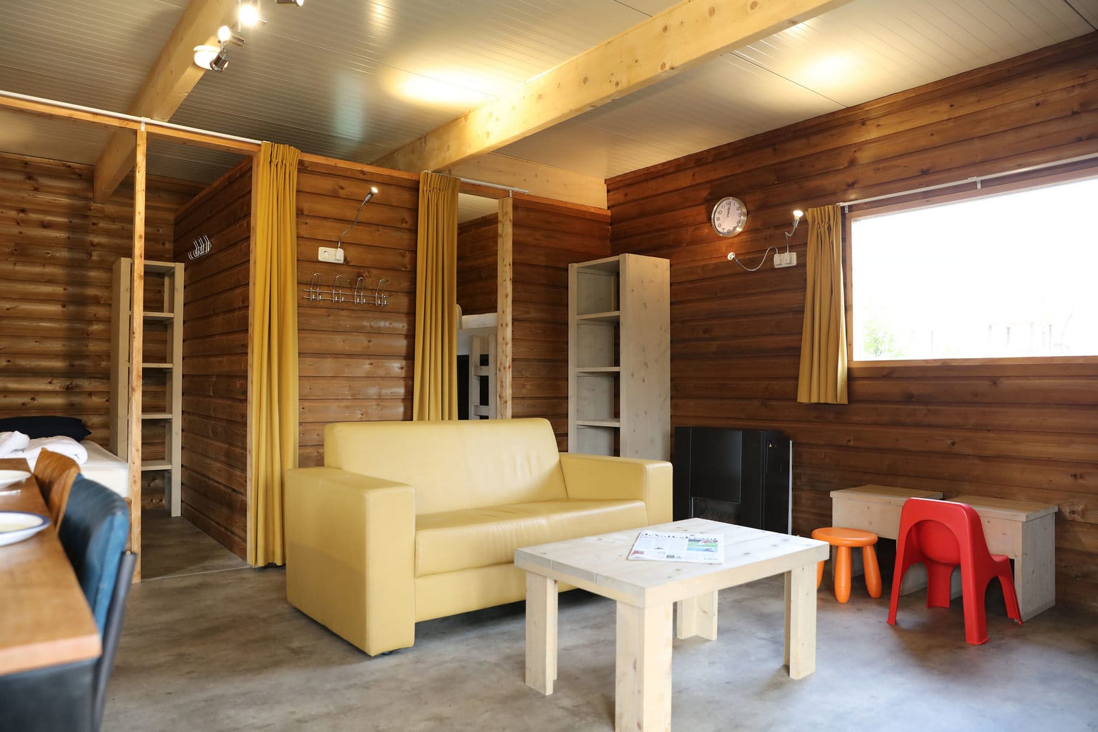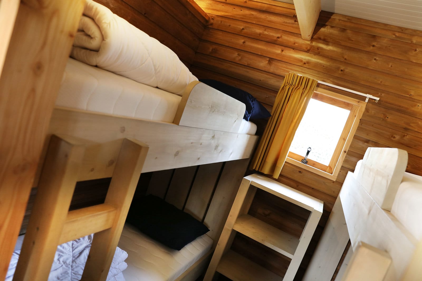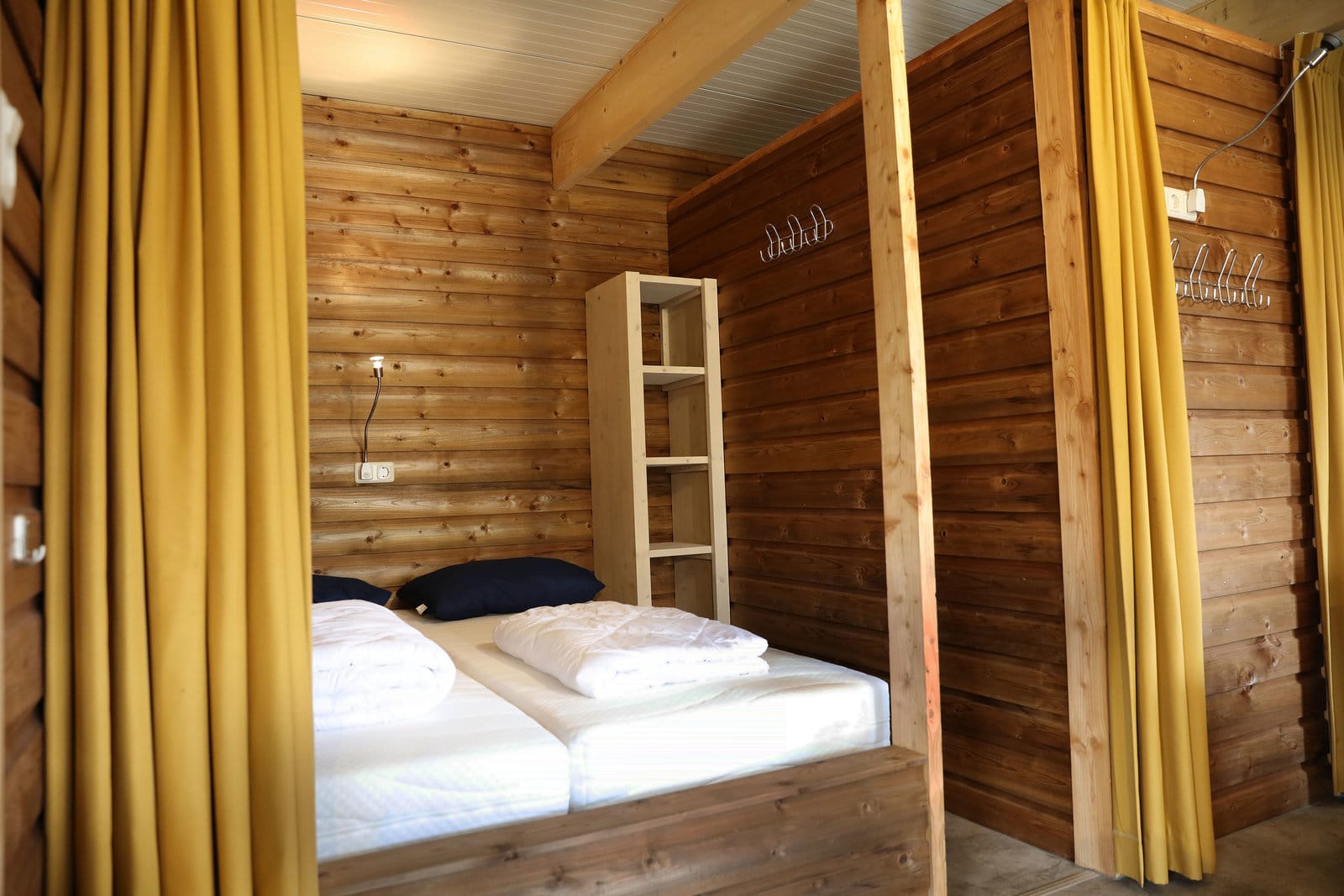 Deze glamping vakantiehuisjes bieden plaats aan maximaal vijf personen en hebben twee slaapkamers. De ene slaapkamer heeft een boxpring voor de ouders, de andere slaapkamer een hoogslaper en stapelbed.