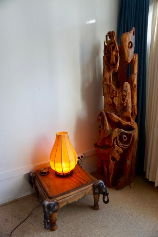 Niet alleen in de ruime woonkamer wordt de sfeer bepaald door twee grote beelden; uit boomstammen gehouwen en prachtige kleurrijke tekeningen, ook in de aparte slaapkamer wordt u omringd door kunst.