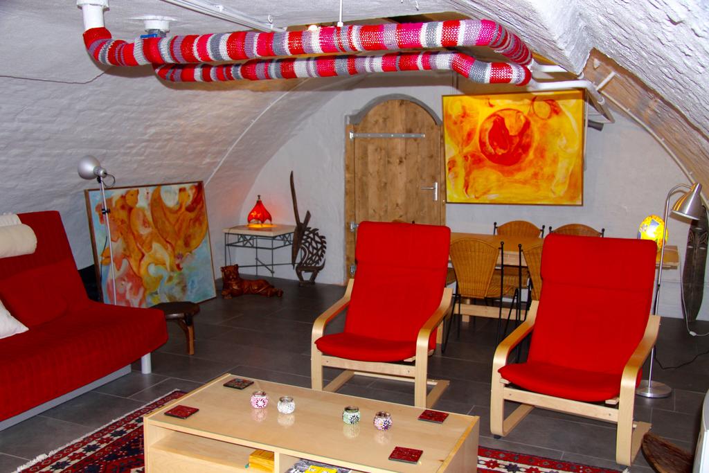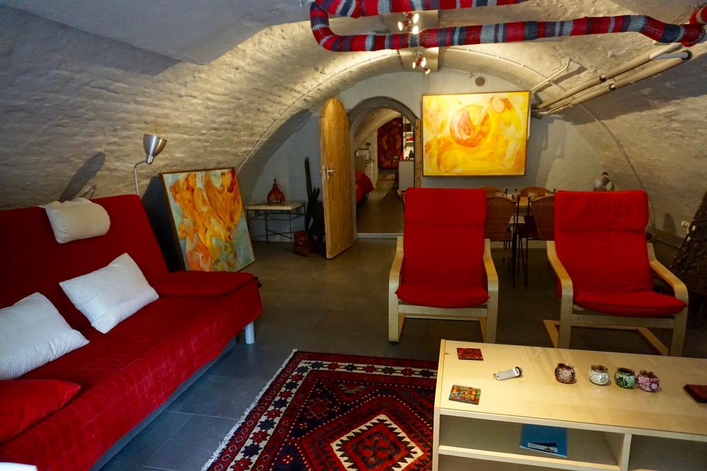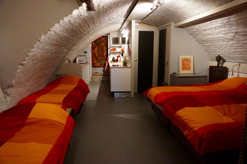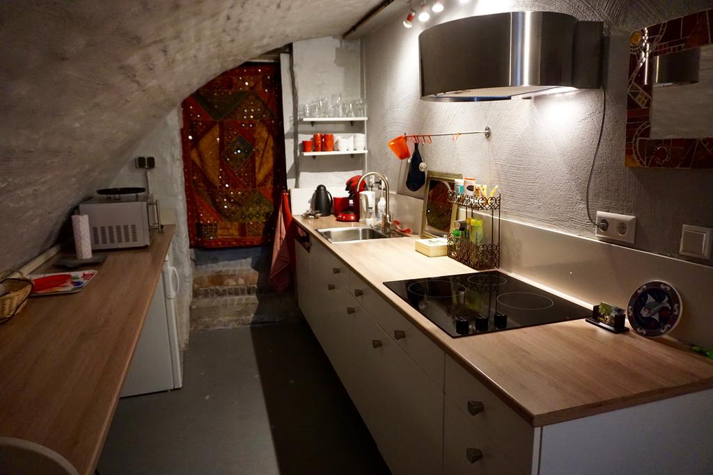 Het keukenblok is ingericht voor simpele maaltijden, daarnaast is er een zithoek met tv en vanzelfsprekend is in deze werfkelder gratis wifi aanwezig.