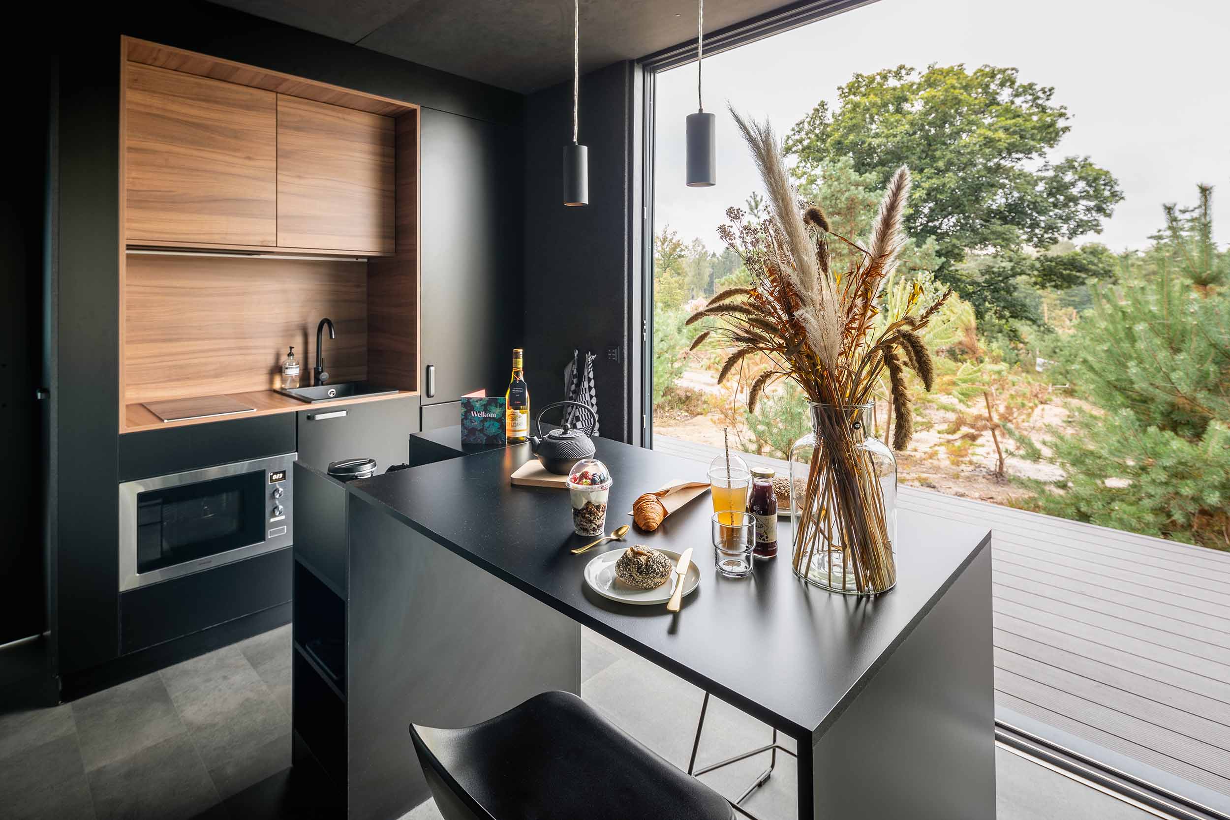 Daar sluit het ontwerp van de suites naadloos op aan. Door de enorme glazen schuifpuien wordt je blik direct naar buiten getrokken.