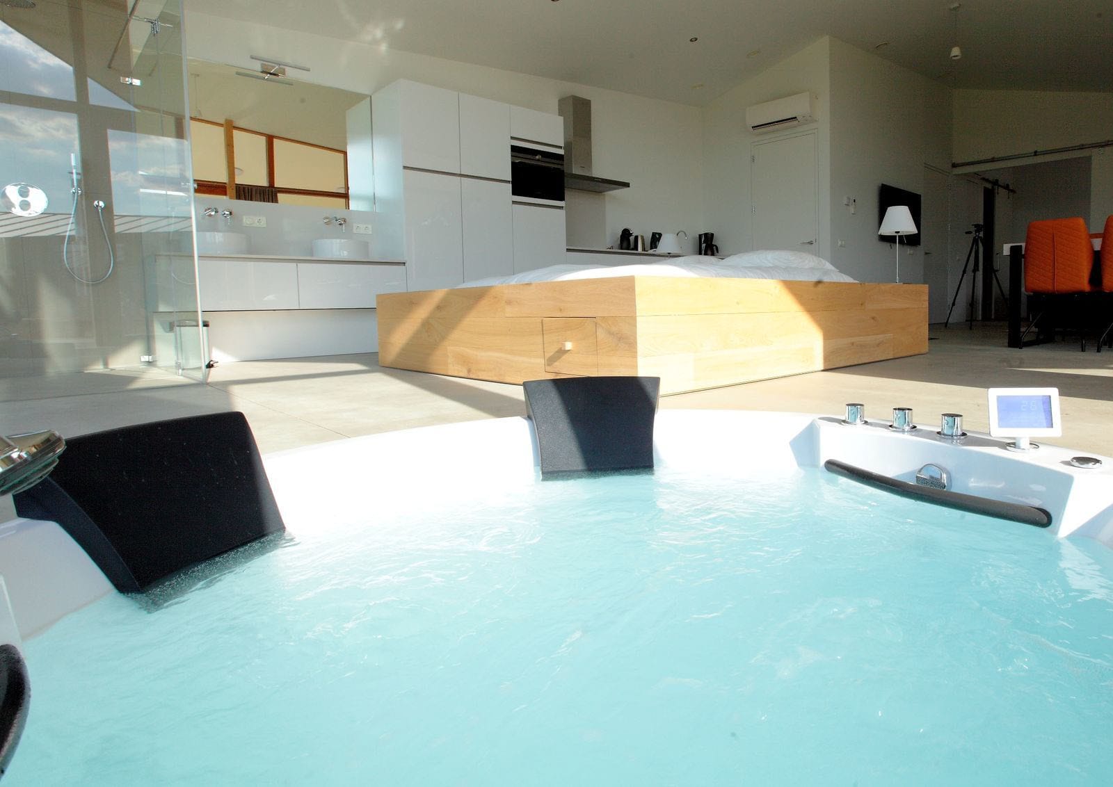 -Open leef-/slaapruimte met loungebanken, tv en eettafel voor 6 personen. In de hoek bij het grote raam staat een jacuzzi, verzonken in de vloer.