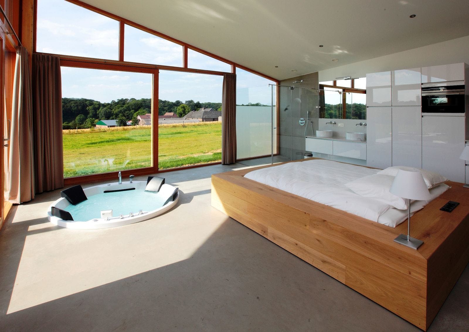 De loft is een hoge en open leefruimte waar je kunt koken, slapen, badderen en loungen. Deze Limburgse natuurvilla’s zijn geschikt voor maximaal vijf personen. Iedere loft heeft twee badkamers (waarvan een in de open ruimte) en een aparte slaapkamer.
