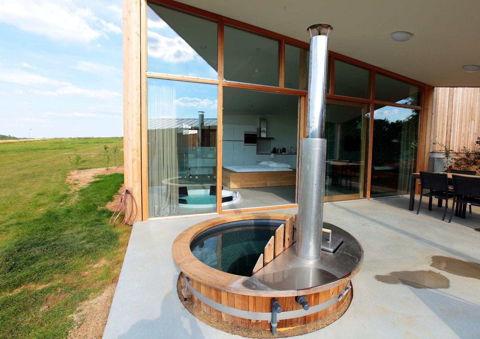 De vakantiewoning is luxe ingericht met gebruik van veel hout en eco-neutraal (zonnepanelen, warmtepompen zorgen voor verwarming en natuurlijke airco).