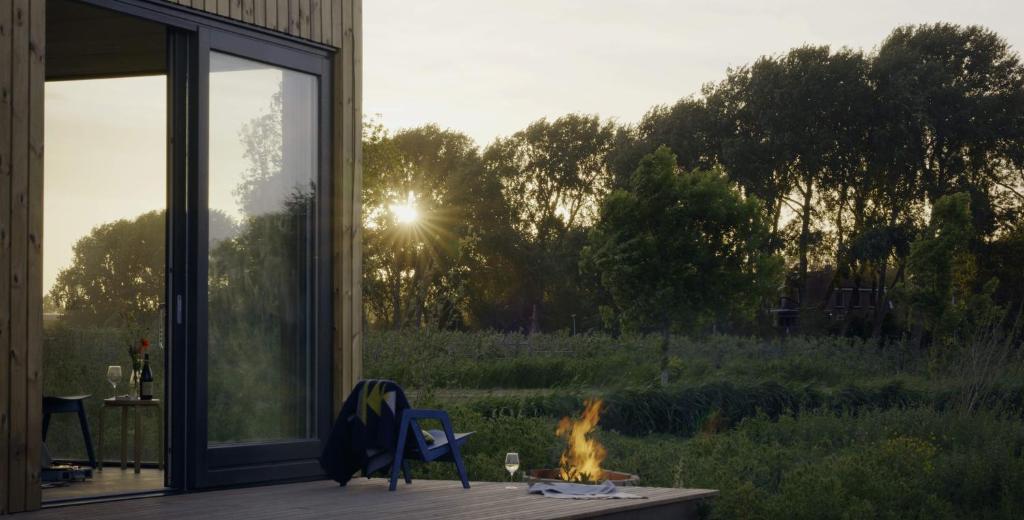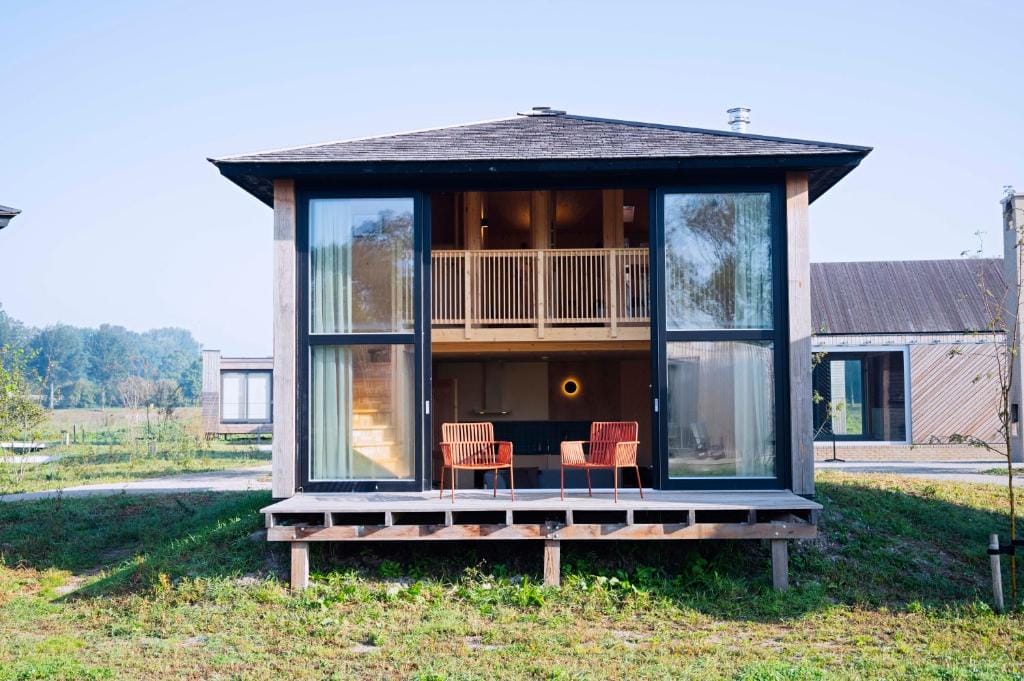 Alle tiny houses op het park van The Unbound in Amsterdam hebben een eigen terras/veranda, houtkachel en ruimte voor vier personen.
