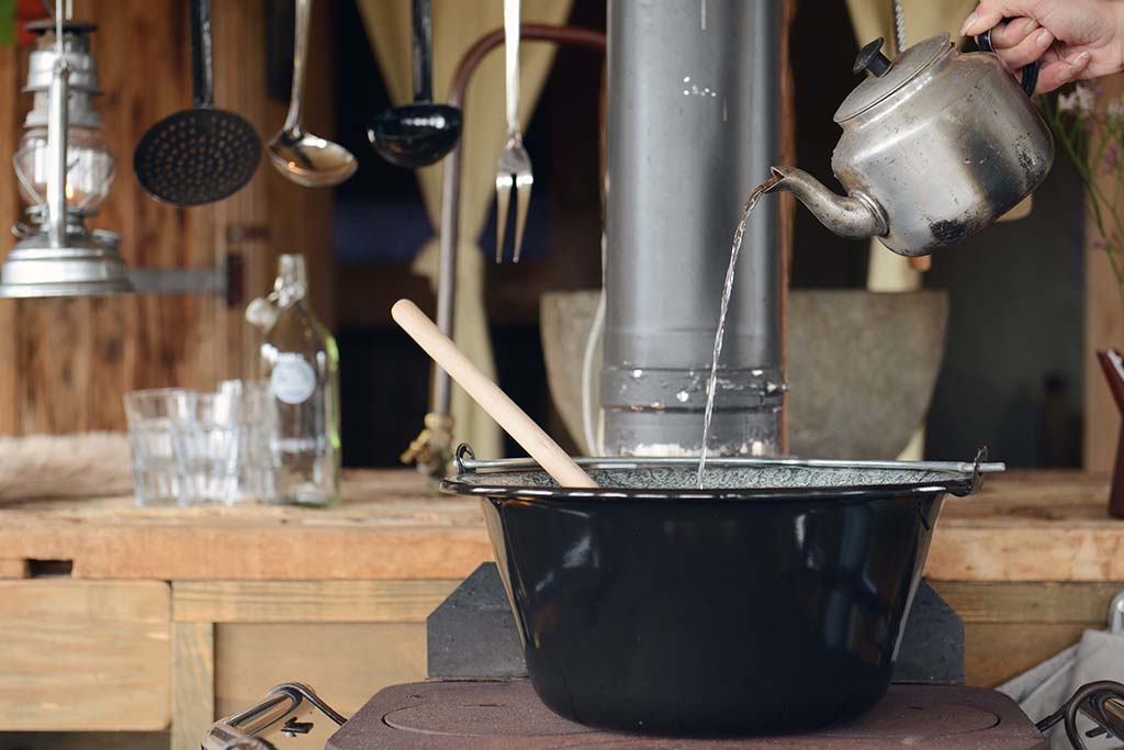 Voor ’s avonds aan tafel alle verhalen van de dag uitgewisseld kunnen worden, moet er natuurlijk eerst worden gekookt. Dit doe je op je eigen houtgestookte kachel of op de houtgestookte kookwagen.