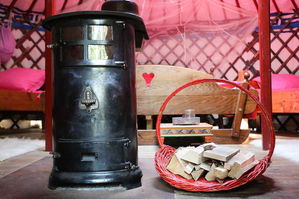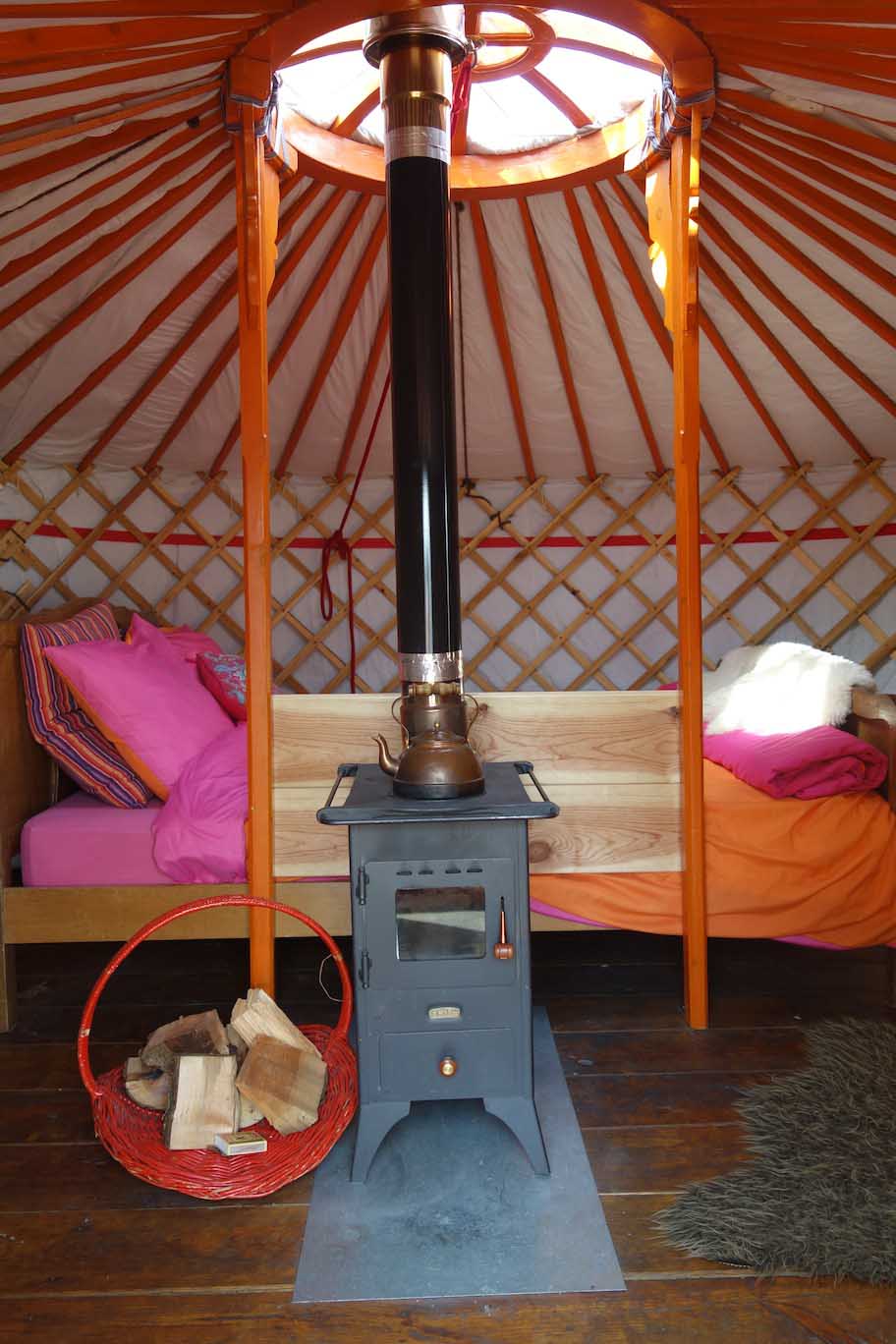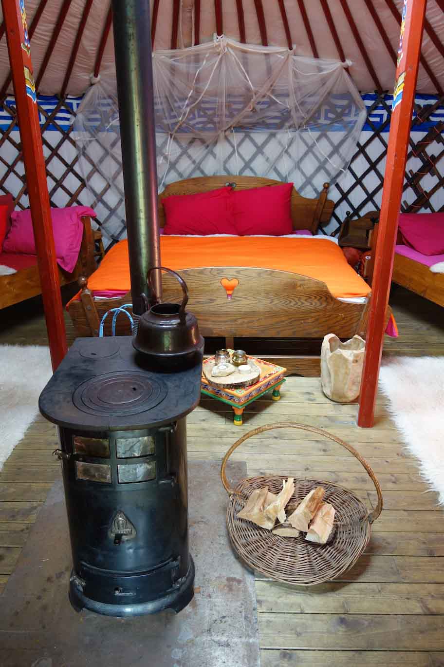 In de yurt kunnen 2 tot 7 personen overnachten, de ‘baby’ yurt is de kleine (romantische) versie voor twee personen. Alle yurts hebben een houtkachel en zijn sfeervol ingericht.