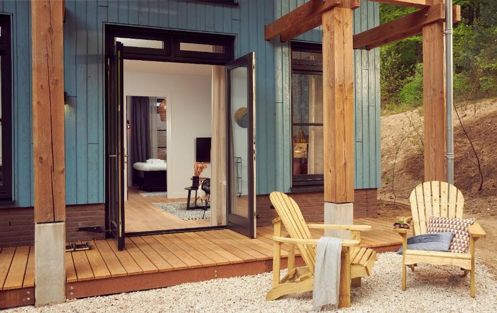 Bijna alle kamers hebben grote glazen schuifdeuren zodat je direct vanuit je kamer het bos in kan lopen!