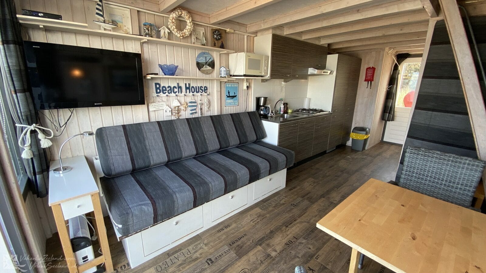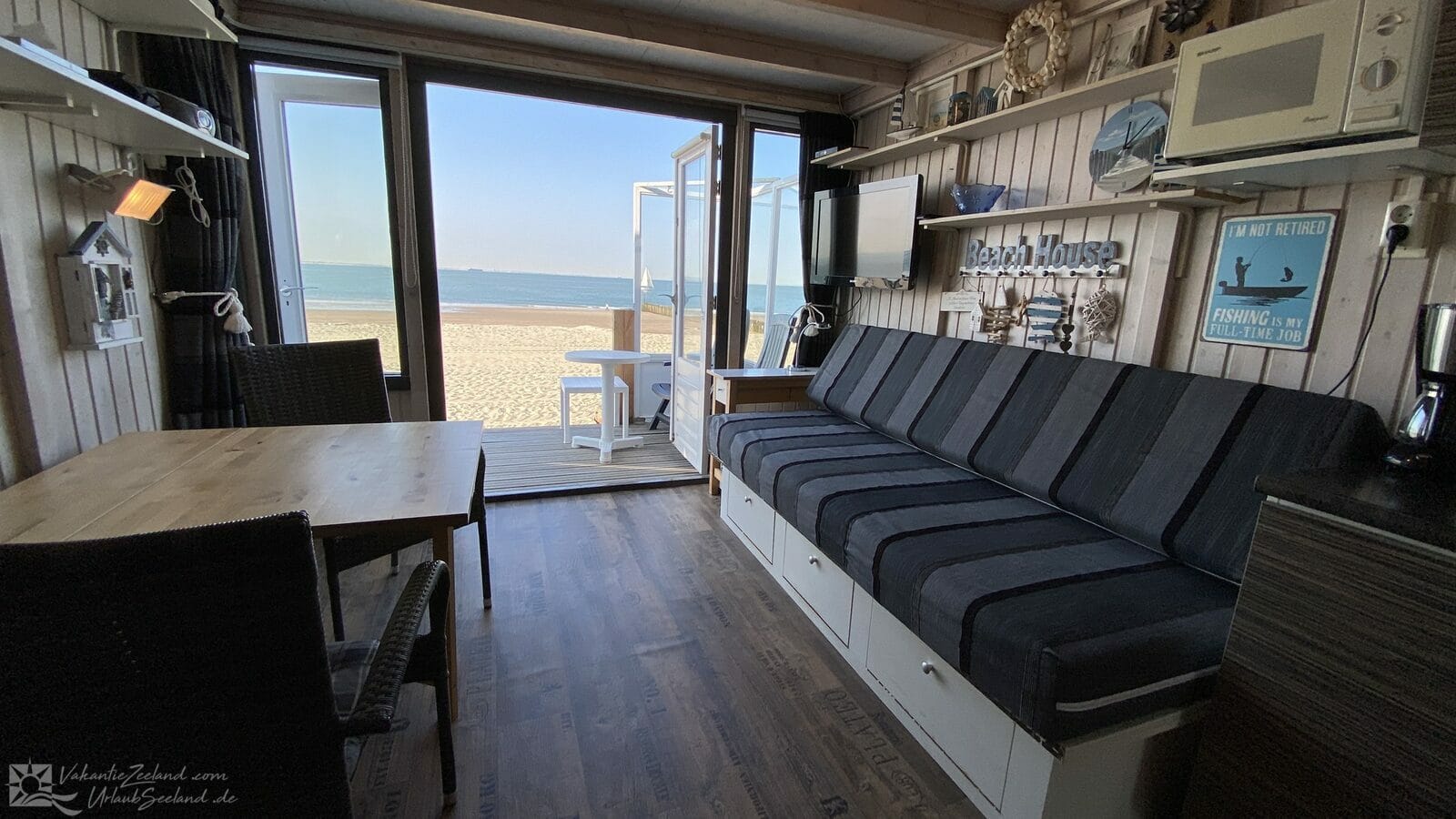 De bank in de woonkamer is dus slaapbank, al moeten we eerlijk zeggen dat het dan wel heel krap wordt in dit strandhuisje in Vlissingen.