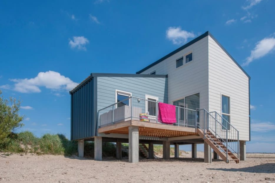 De locatie óp het strand is het unieke aan deze strandhuisjes, maar deze huisjes zijn ook best luxe. De huisjes zijn dus geschikt voor zes personen en vrij knus. Op het strand leeft u immers buiten en vooral op de veranda en geniet u van het panoramische uitzicht. U kijkt letterlijk uit op Neeltje-Jans!