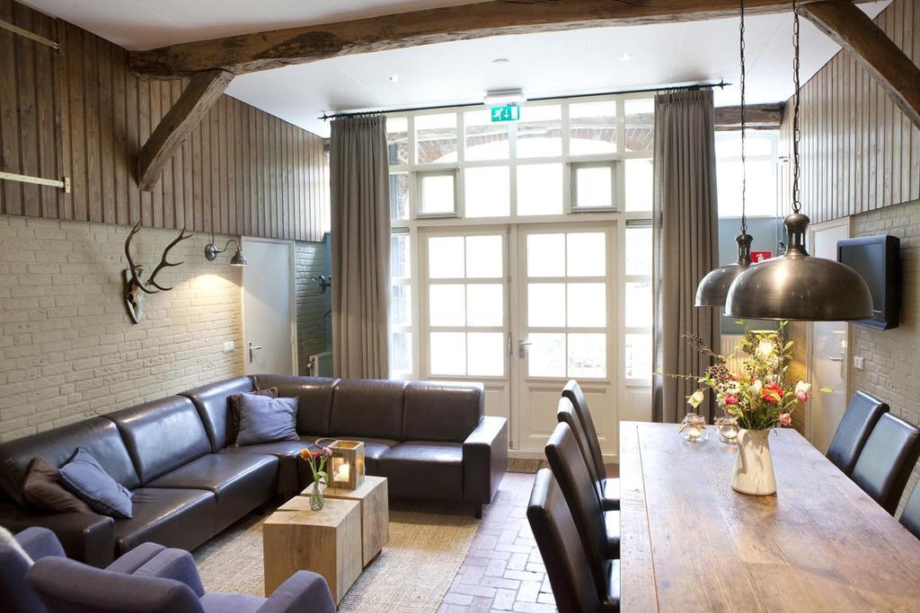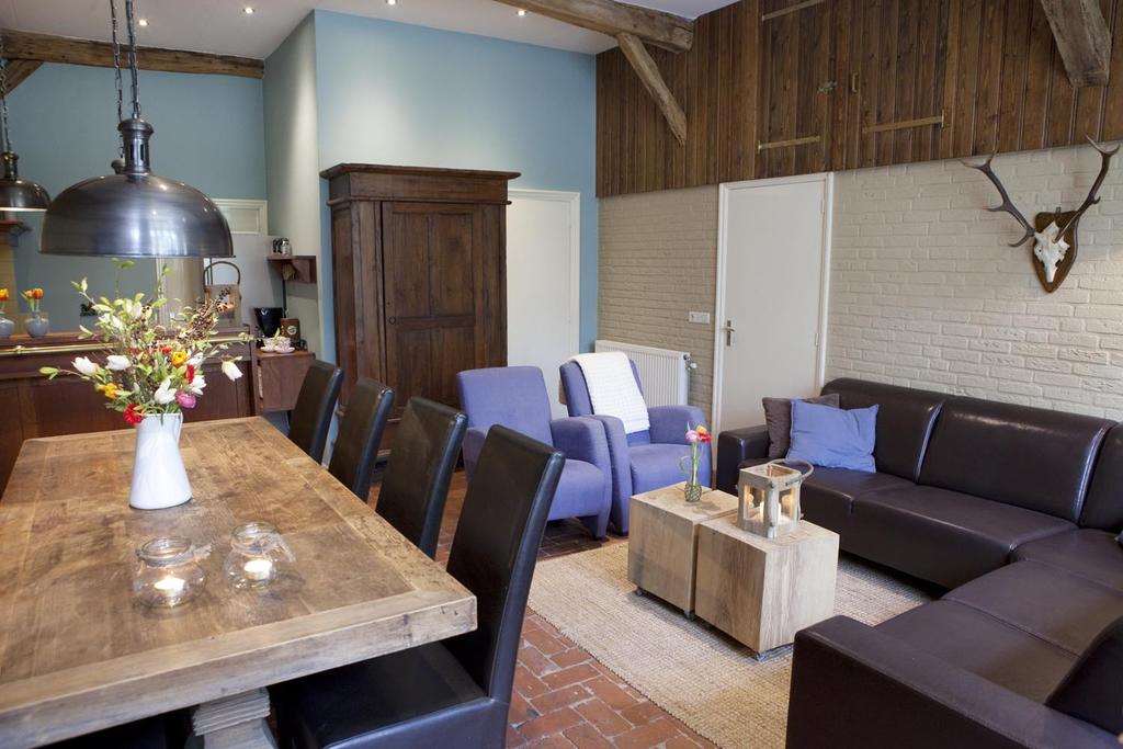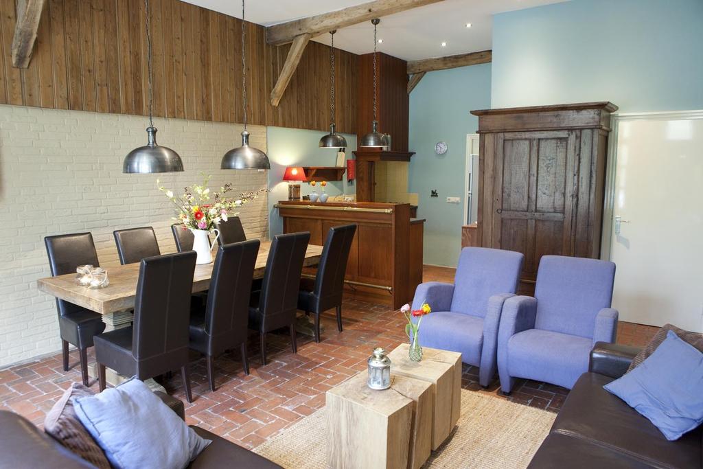 Binnen zorgen eiken balken en een eiken plafond en vooral de houtkachel voor sfeer. De gevel van het pand bestaat tot in de nok uit glas, wat een prachtig uitzicht over de weilanden biedt.
