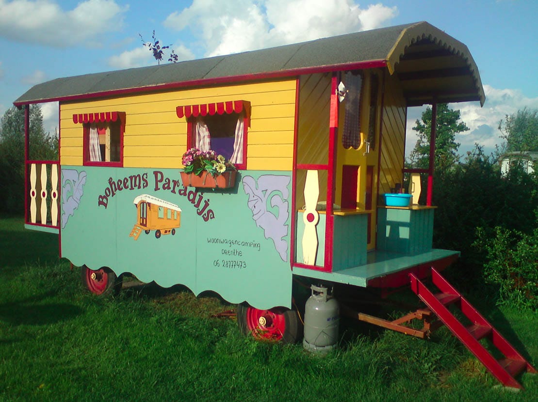 Deze authentieke woonwagens of pipowagens zijn geen omgebouwde schaftketen, maar echte oude woonwagens van een circus, kermis of zigeuners.