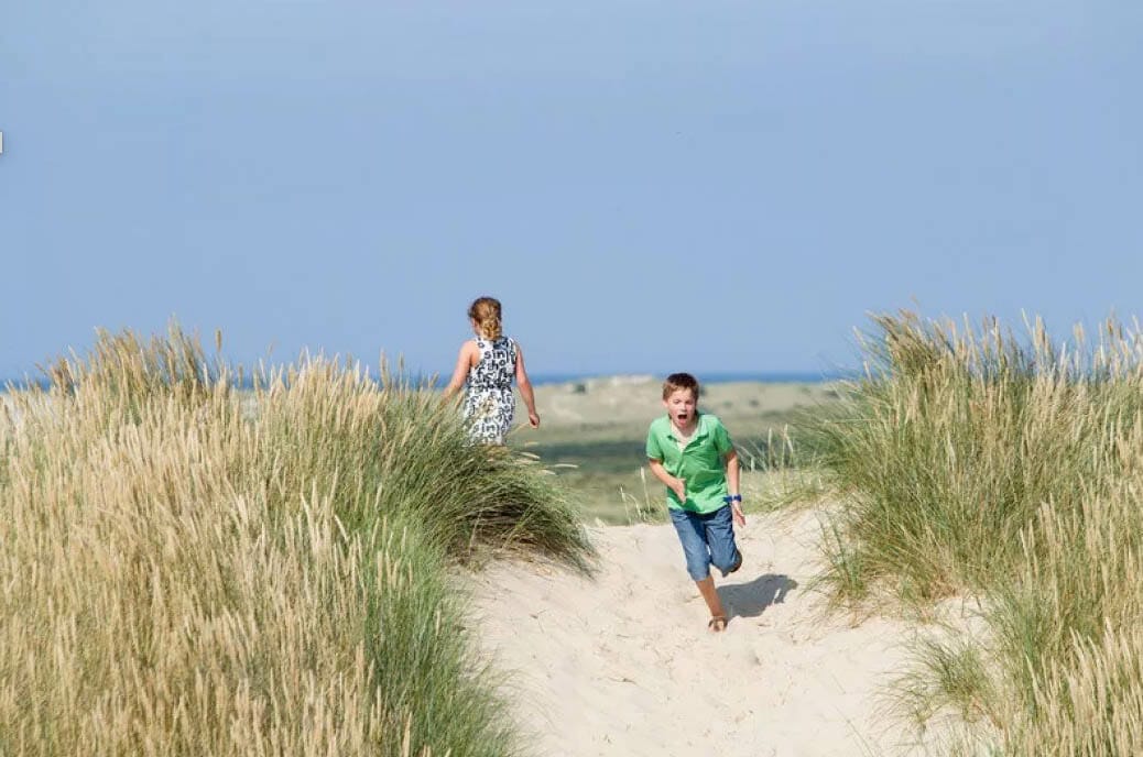 Vanaf de boerderij loop je zo de duinen in en op een mooie dag ben je binnen tien minuten op het strand.