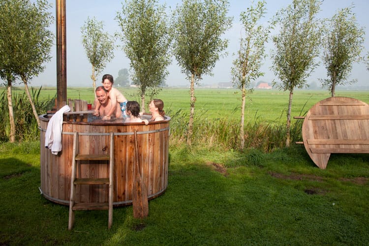 Geniet bij een ondergaande zon van de warme hottub met een écht Fries Us heit Biertje, terwijl de kinderen nog lekker aan het spelen zijn rondom het kampvuur.