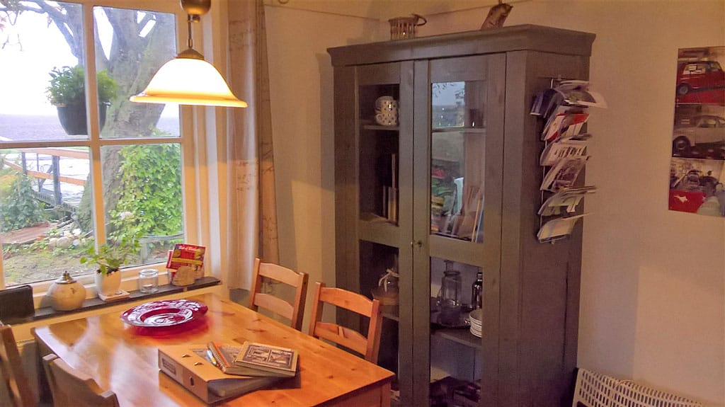 In de eetruimte staat een vierpersoons tafel en een servieskast met de nodige attributen zoals boeken, spellen, foldermateriaal etc, daarnaast een pantry met koelkast, Nespresso koffiezetapparaat en waterkoker.