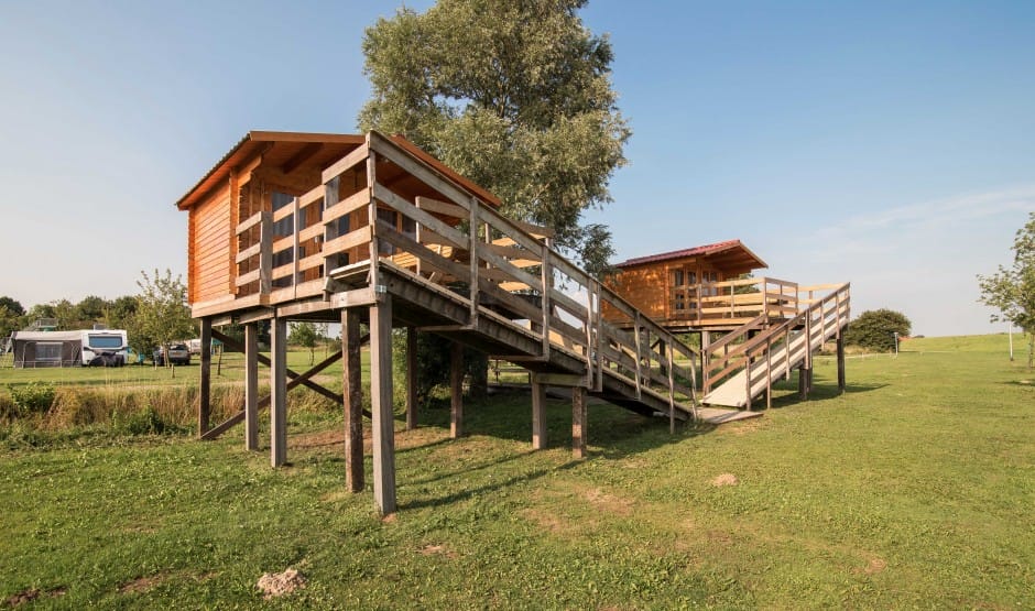 Omdat de paalhutten drie meter boven de grond staan, heeft u in de richting van Doesburg een uniek en prachtig uitzicht over het water en de dijk. U geniet van dit uitzicht en de rust vanaf uw eigen terras “op hoogte”.