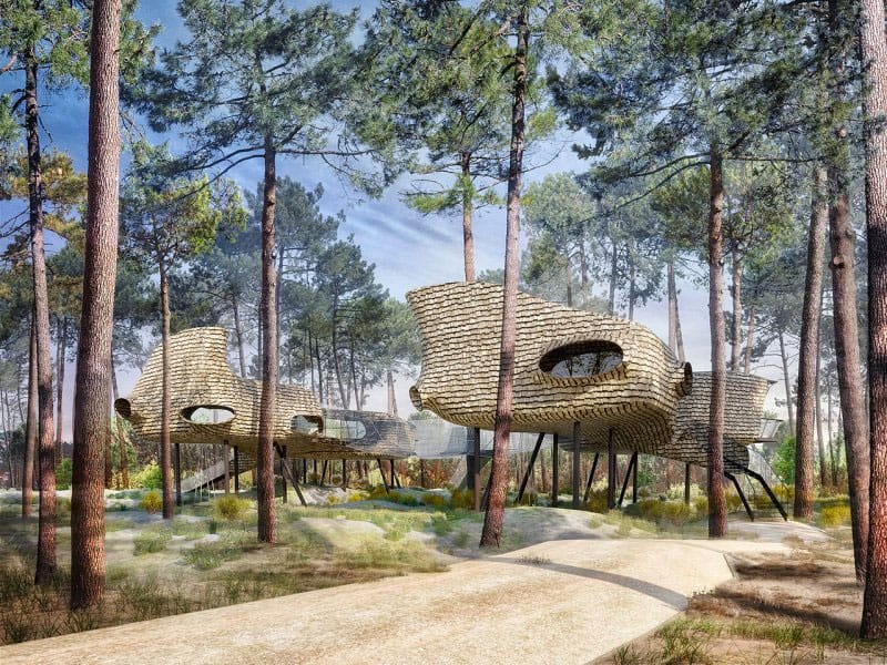 In de boomhutten worden gasten volledig ondergedompeld in de wereld van het bos. Door het verhoogde ontwerp lijken deze op een nest en bieden ze vrij uitzicht over de pijnboombossen van de Landes. Door de sfeervolle inrichting voel je je hier onmiddellijk thuis en de vele openingen naar buiten bieden uitzicht op de omringende natuur.