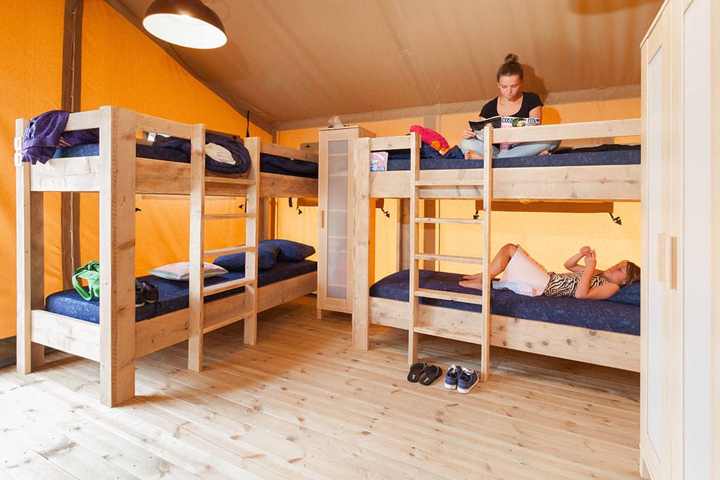 Er staat een comfortabel tweepersoonsbed en er zijn twee stapelbedden, in totaal kunnen er zes mensen verblijven in deze safaritent op het water.