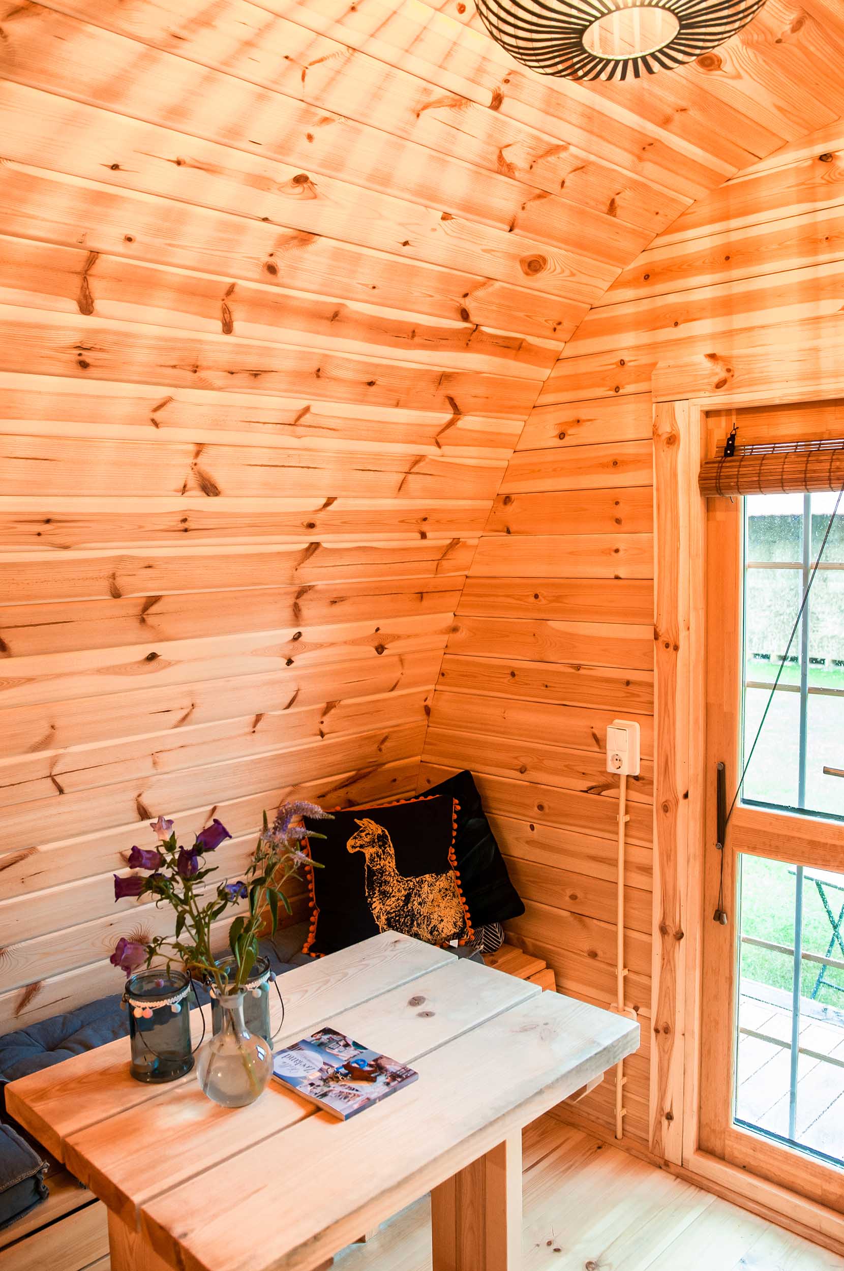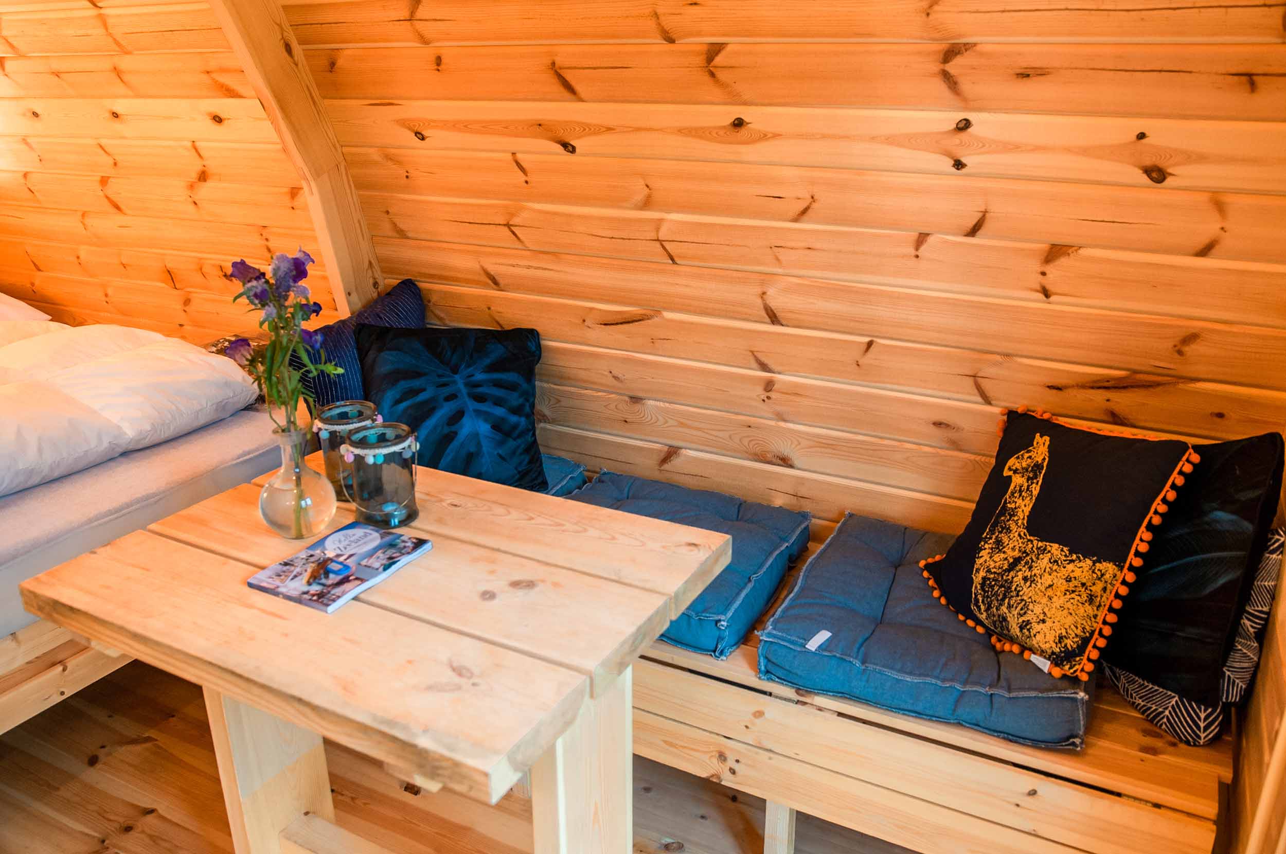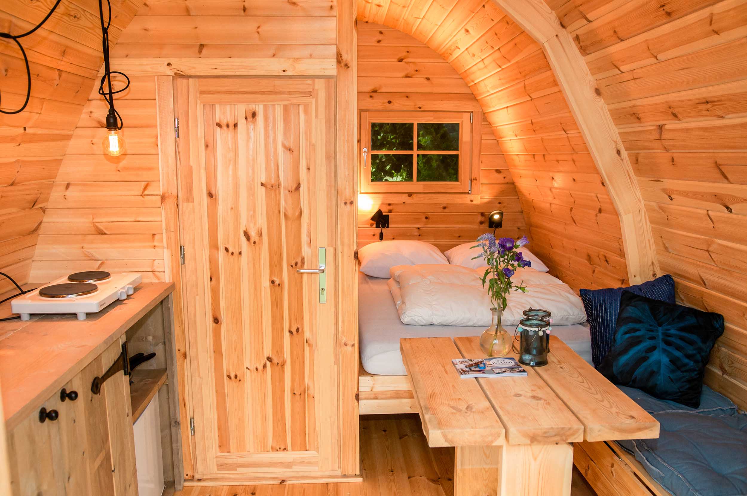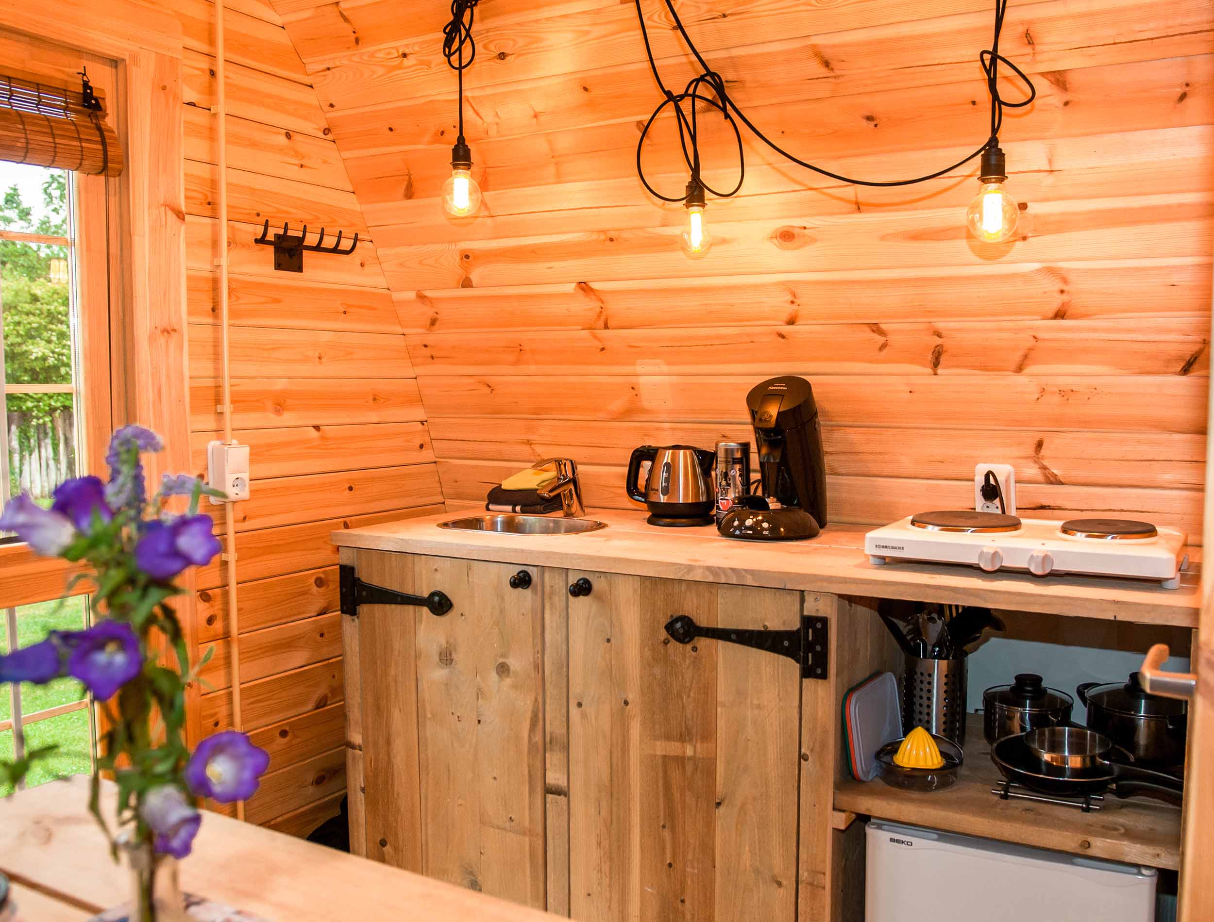 De Camping Pod is klein maar fijn, en van veel gemakken voorzien. Het keukentje is uitgerust met onder meer een klein koelkastje, waterkoker en Senseo-apparaat. Daarnaast is het goed toeven op de bank en aan tafel.