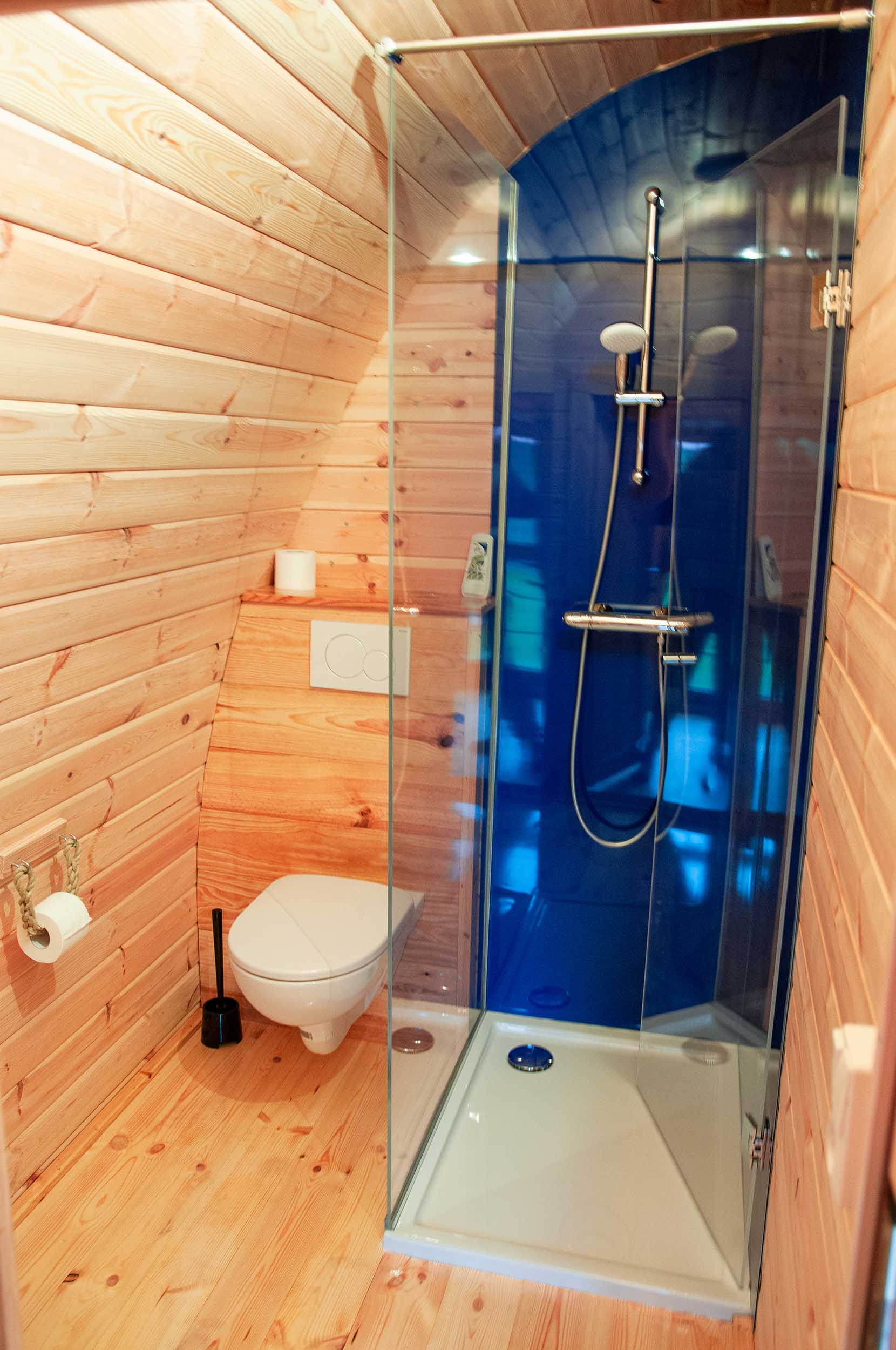 De CampingPod heeft een eigen badkamer in de Pod zelf dus je hoeft hiervoor niet naar buiten. In de badkamer zit een douche, toilet en een kastje.