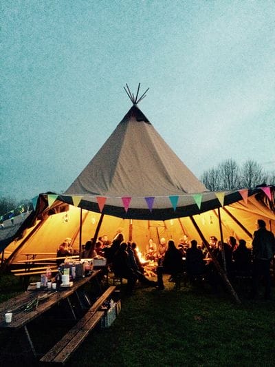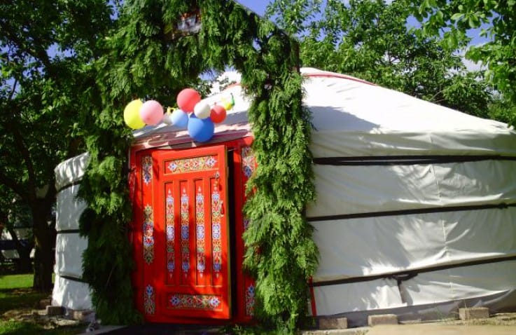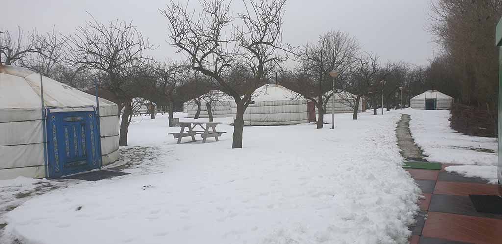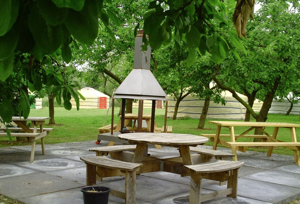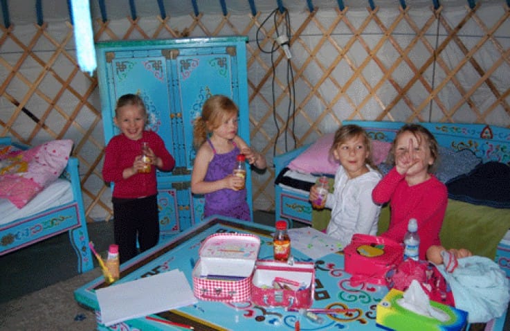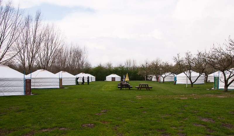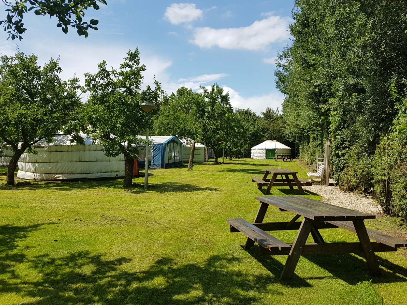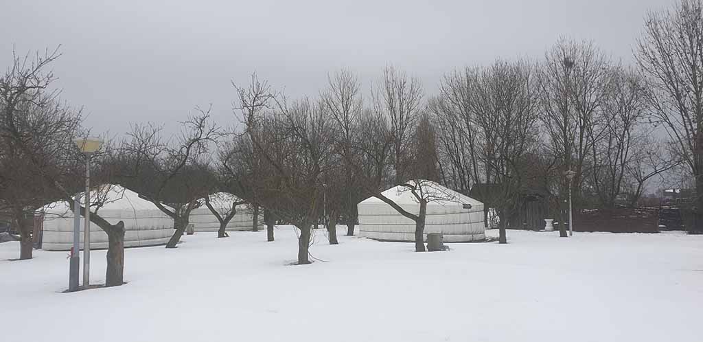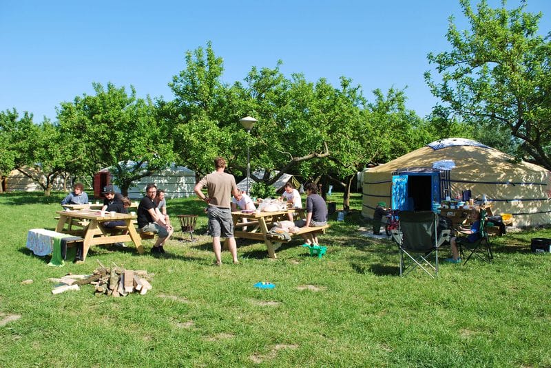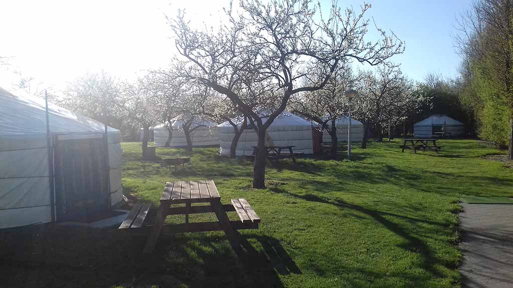 Tussen de pruimenbomen in de voormalige boomgaard staan maar liefst 15 Mongoolse Gers, ook wel Yurts genoemd.