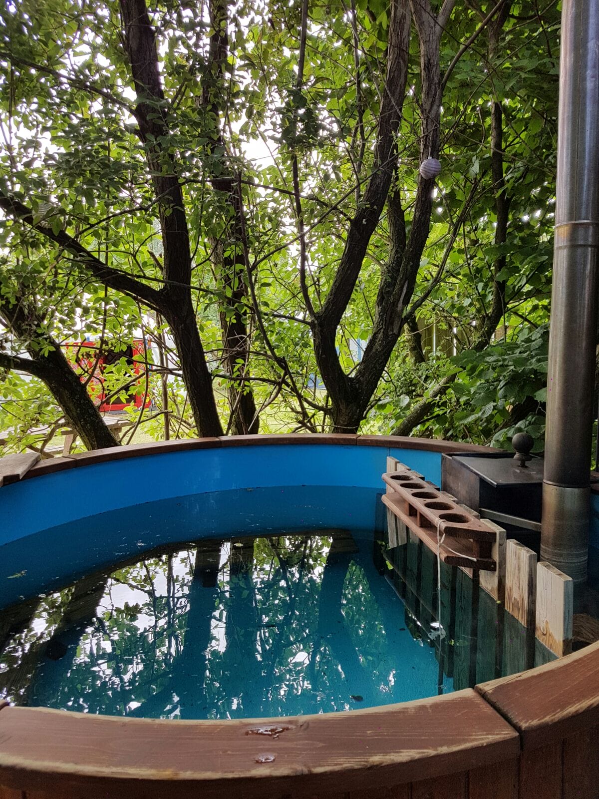 U kunt dan gebruik maken van de sauna en de regendouche behorende bij de sanitaire voorzieningen, maar belangrijker; u kunt onbeperkt in de houtgestookte hottub dobberen bij uw eigen tent!