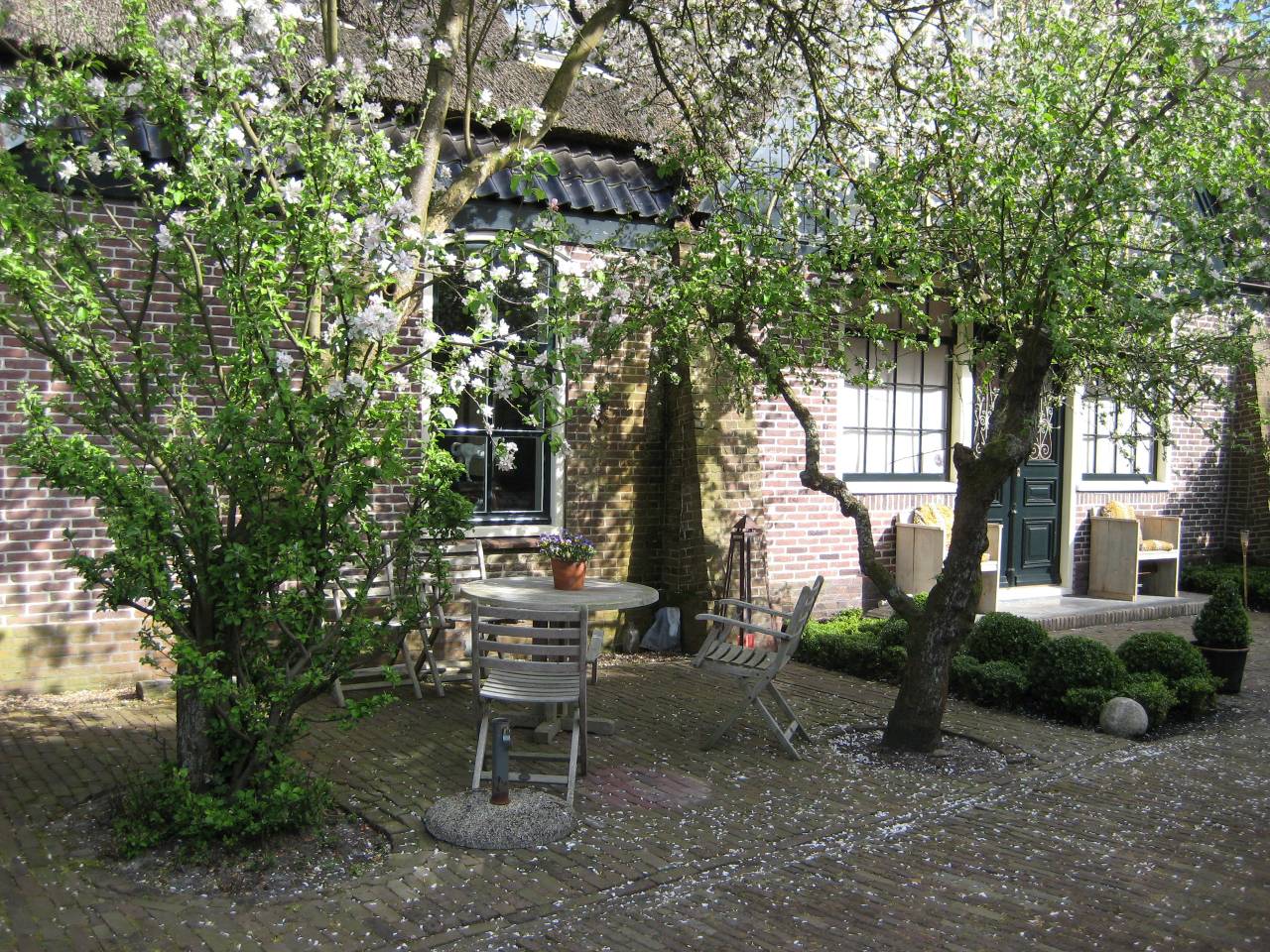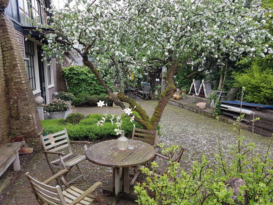 Buiten in de tuin kunt u op het terras onder de appelboom heerlijk genieten van de zon.