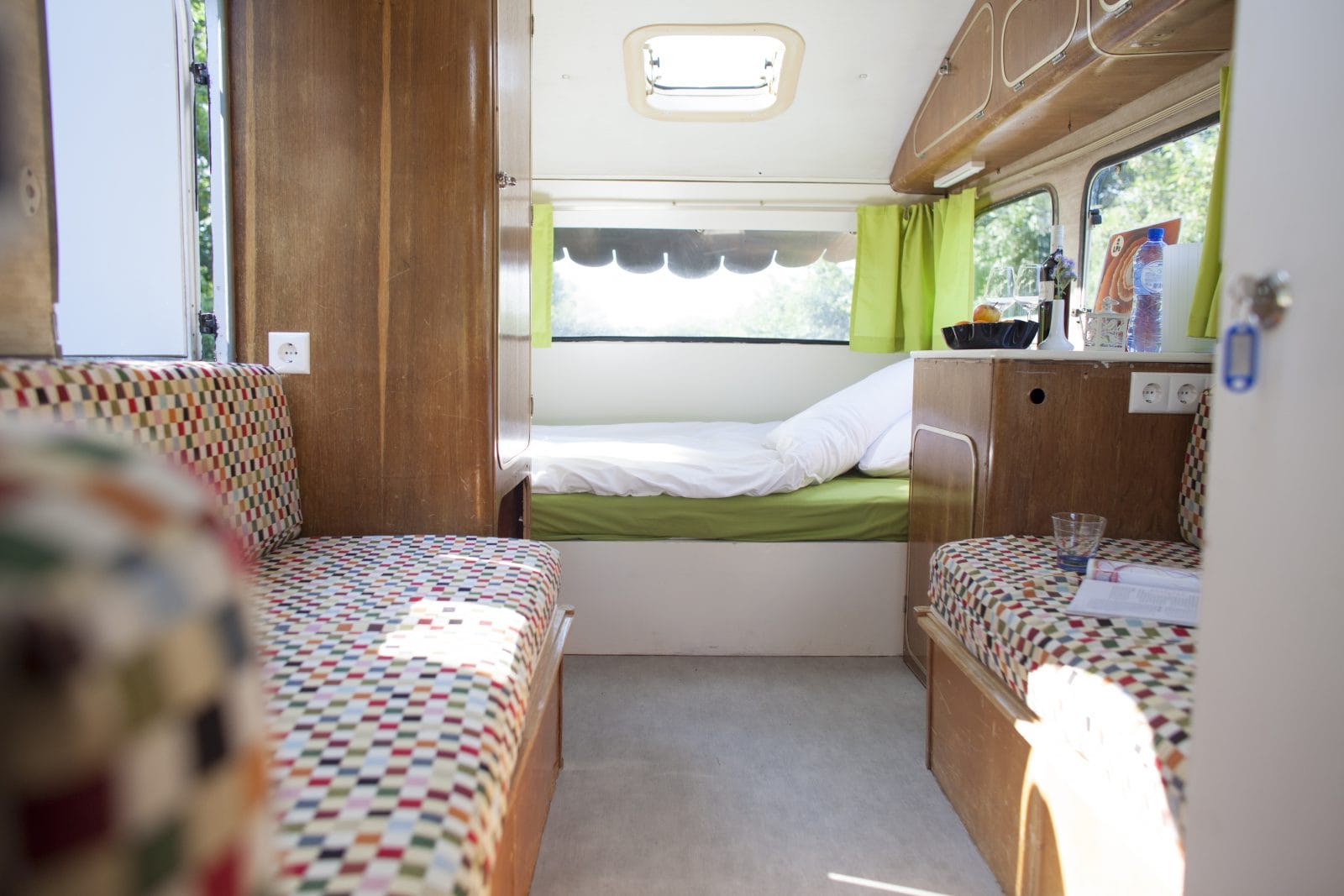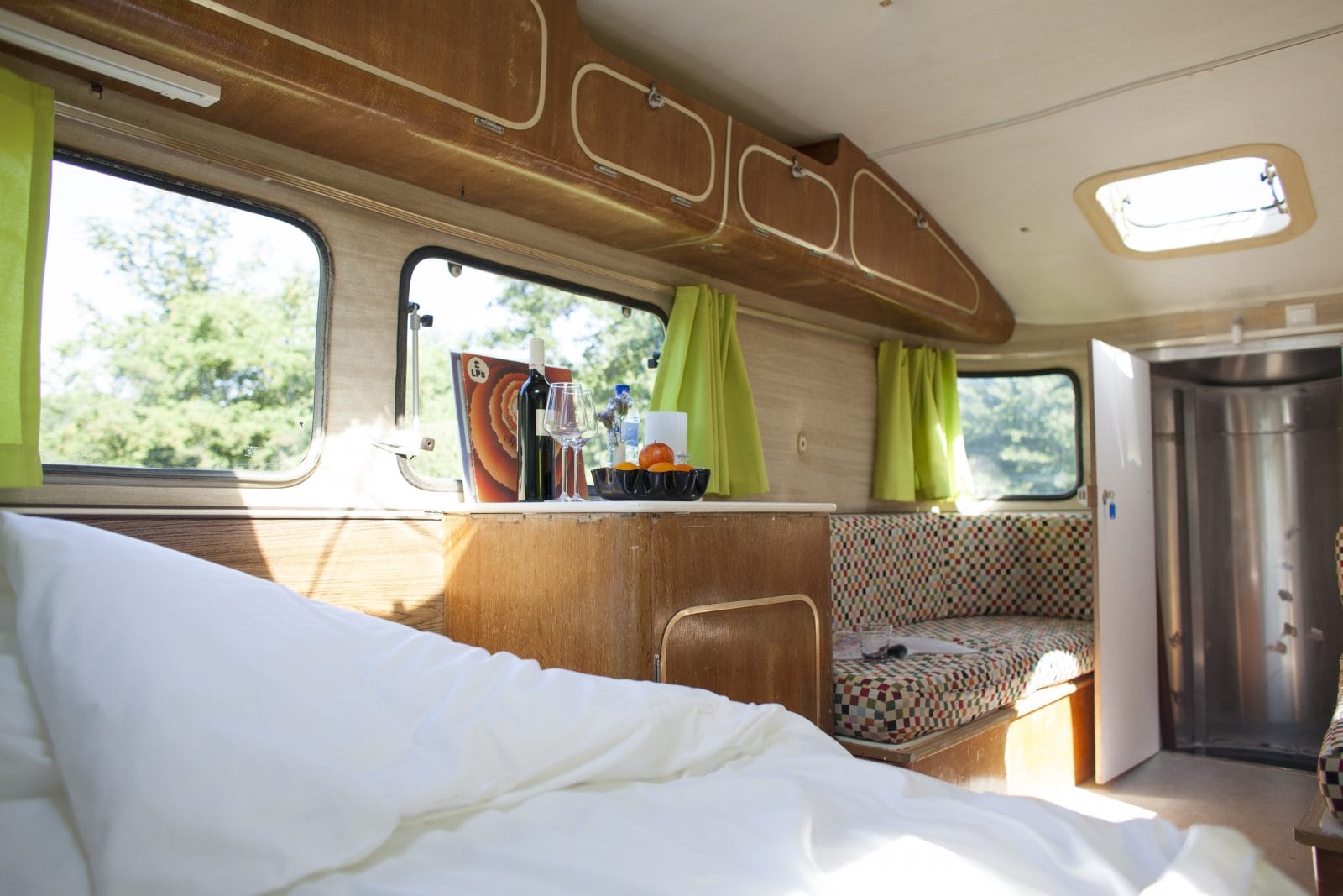 Even alle zorgen vergeten, tussen de bomen wakker worden tussen de vogels. Deze oldtimer caravans staan met hun poten in de dierenweide.