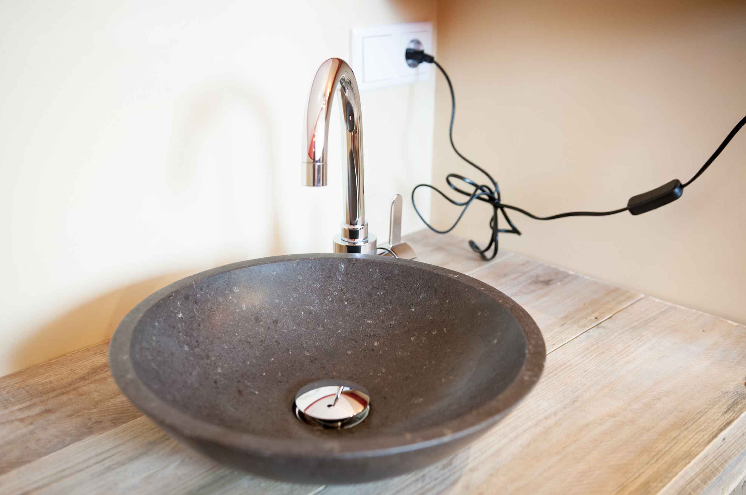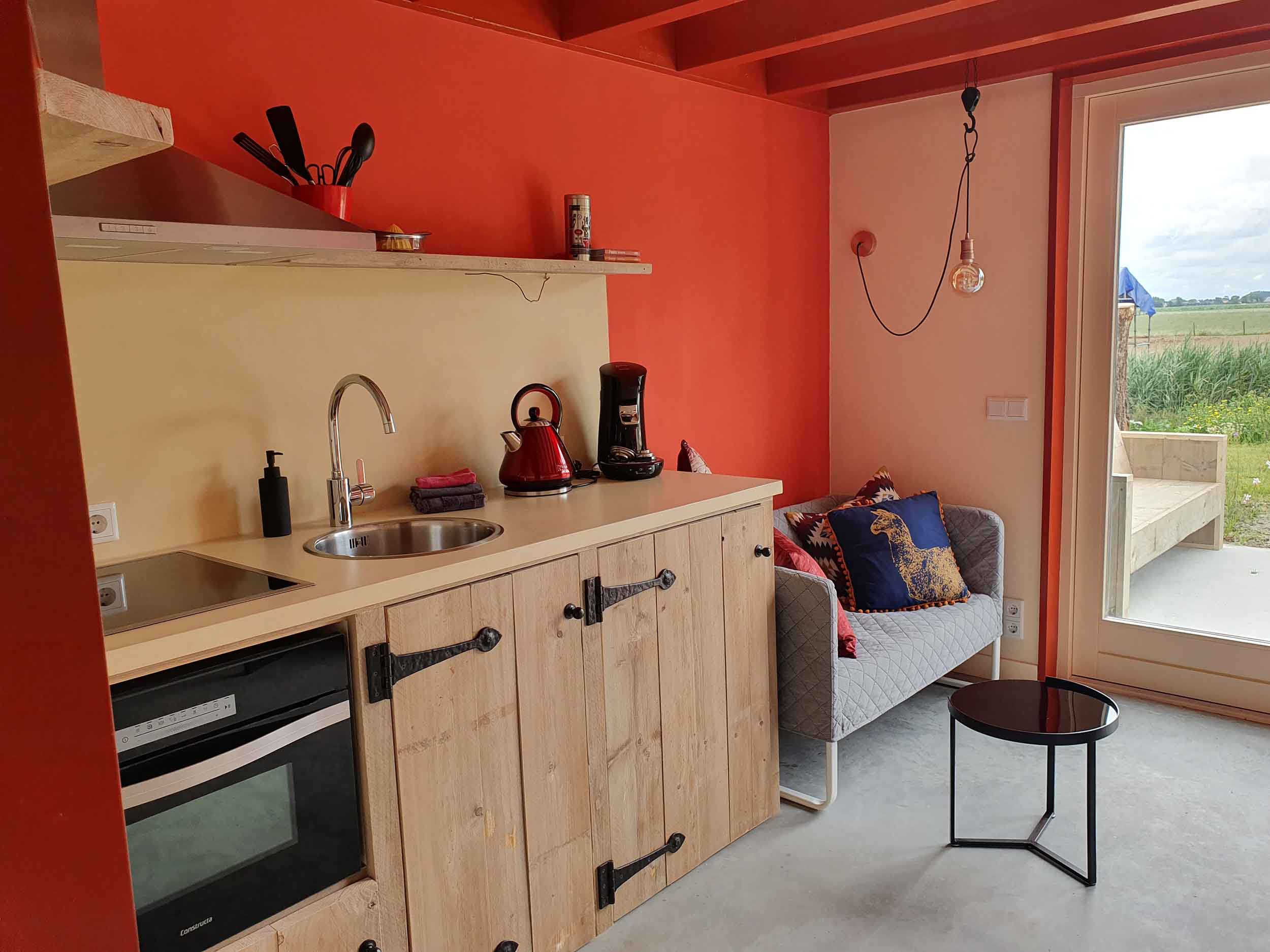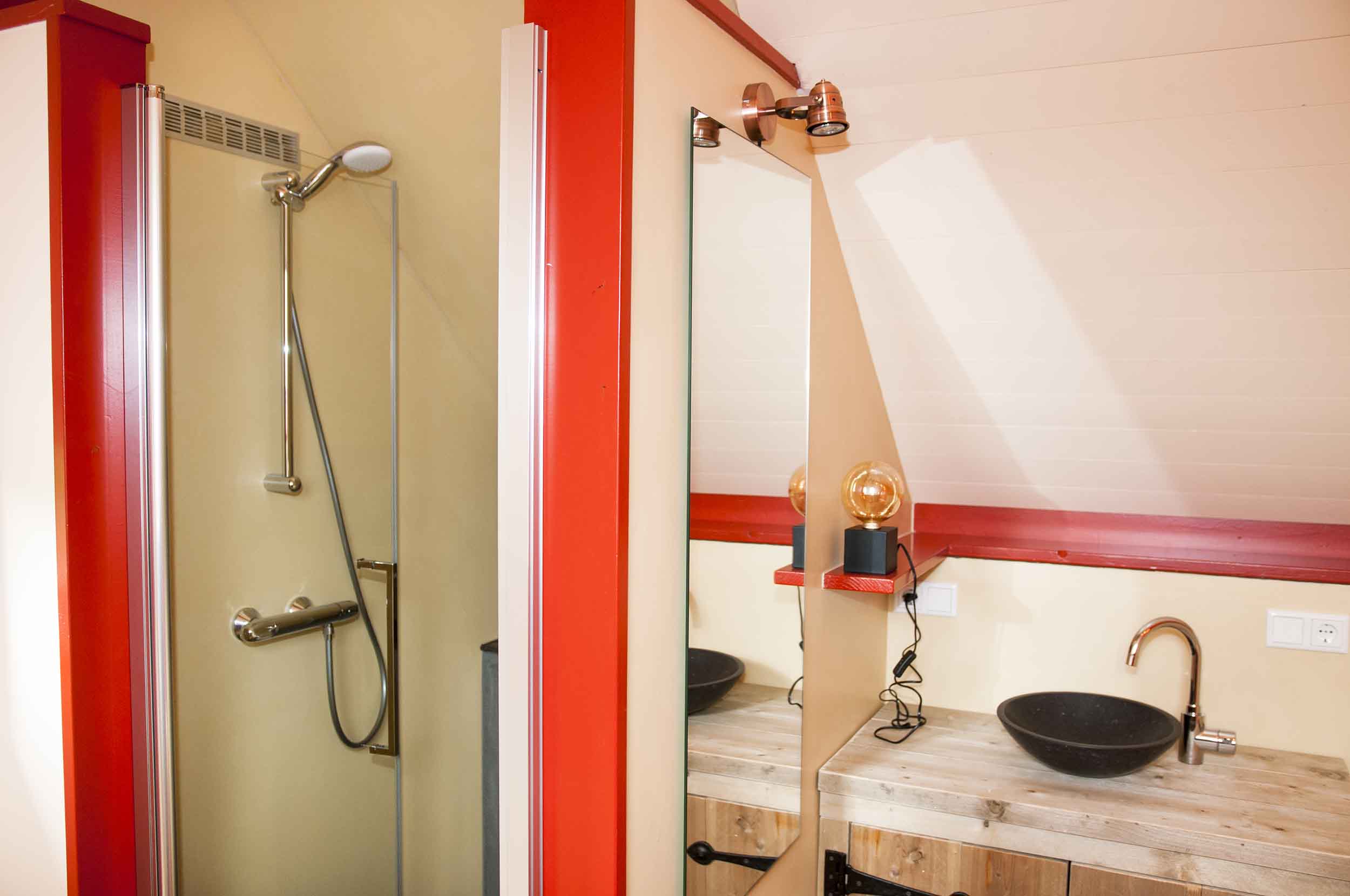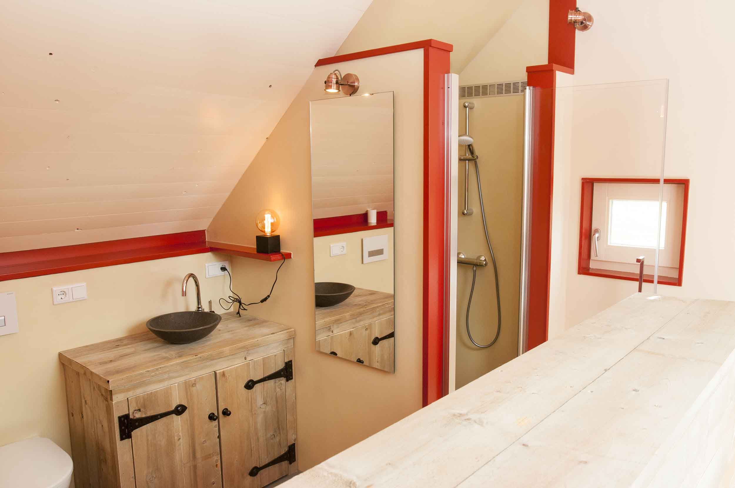 De schuilstal is geschikt voor twee personen en de open keuken heeft een koelkast, combi- magnetron, afwasmachine, inductiekookplaat, Senseo koffiezetapparaat, waterkoker. Op de tweede verdieping is een inloopdouche, wastafel en tweede toilet.