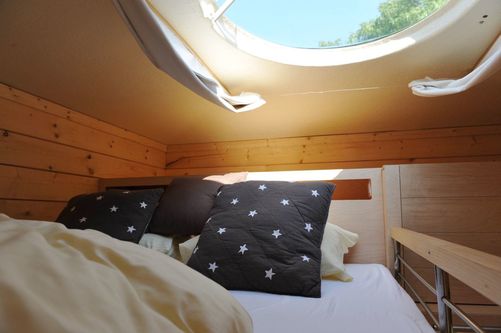 Vide met tweepersoonsbed en lichtkoepel in het dak en een telescoop met informatie over het sterrenheelal.