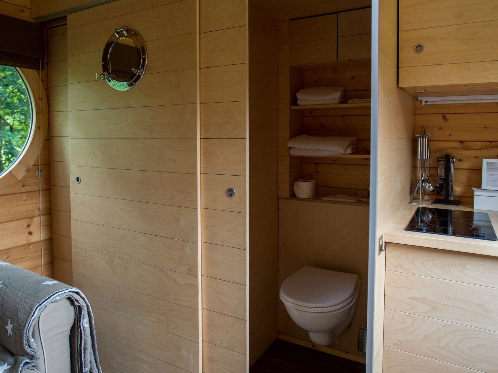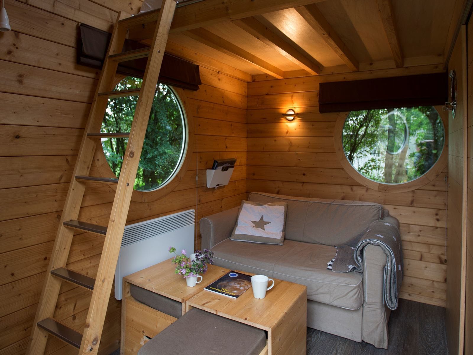 Begane grond met slaapbank (1.40 x 1.20m), salontafel met inschuifbare krukjes, design elektrische verwarming, kitchenette met twee keramische kookplaten, koelkast, senseo, waterkoker, magnetron, servies en kookgerei. Verder is er een douchecabine en apart toilet.