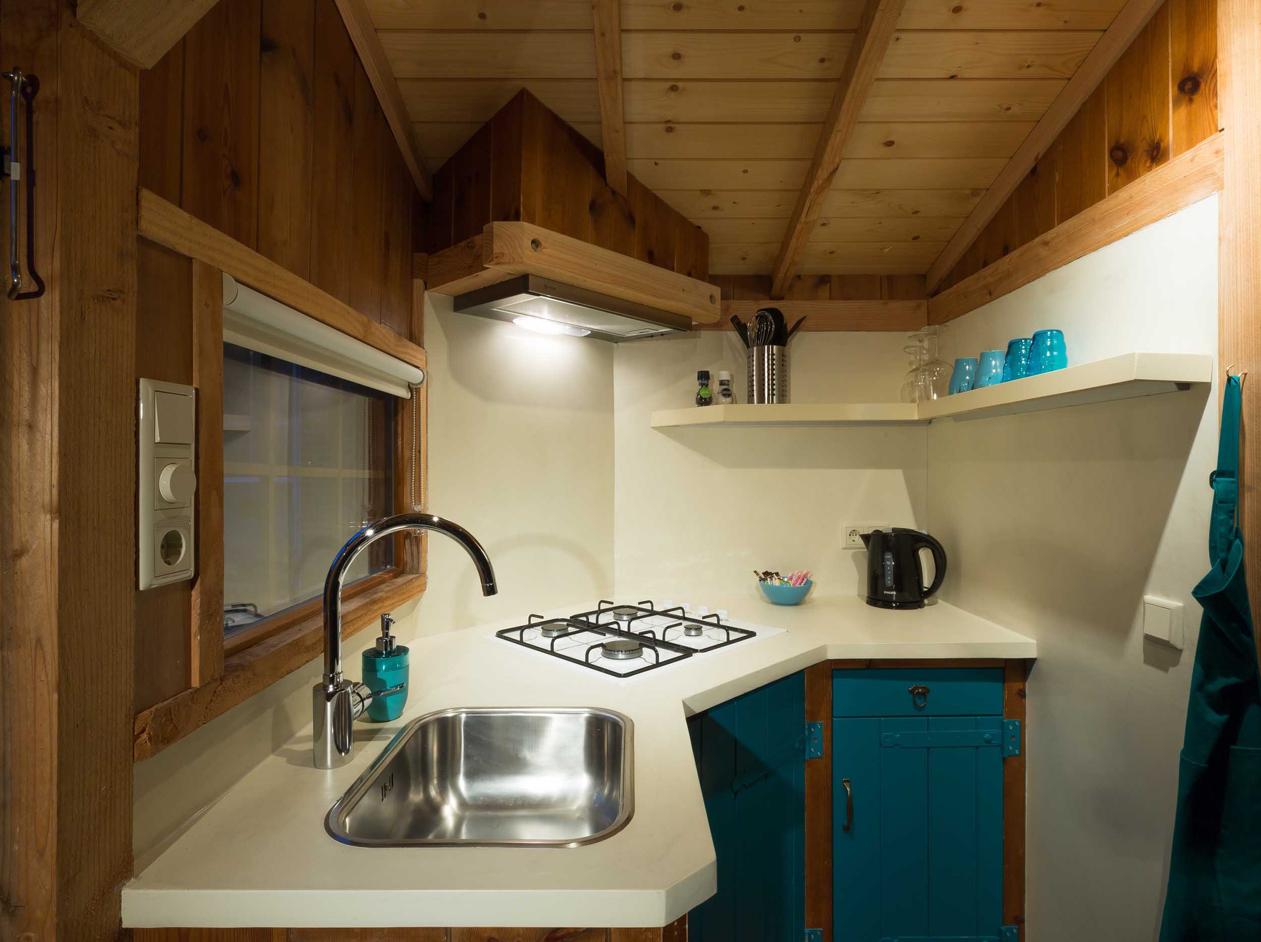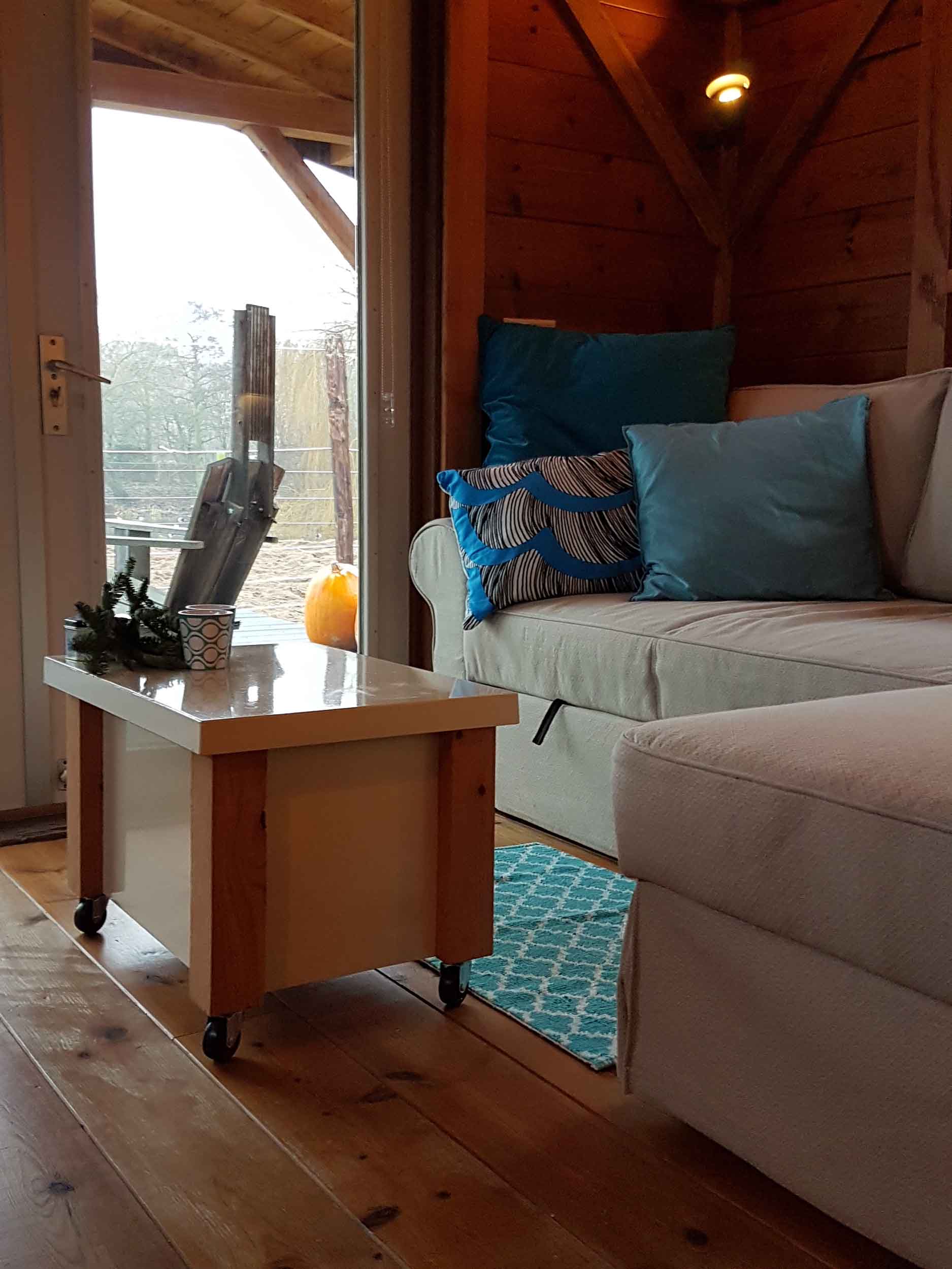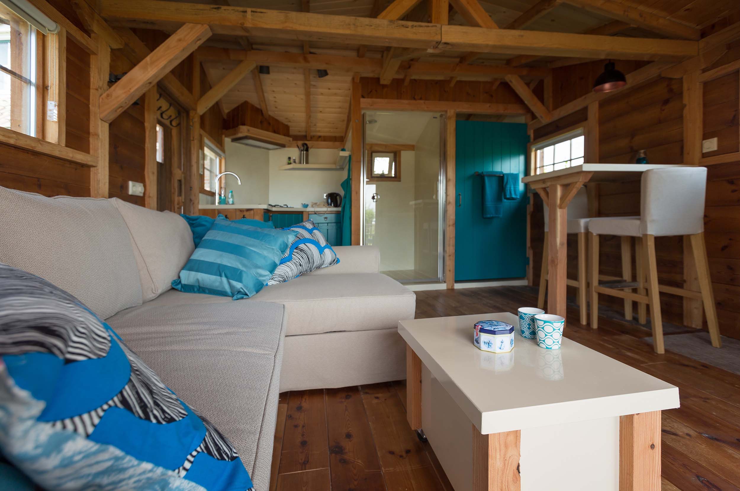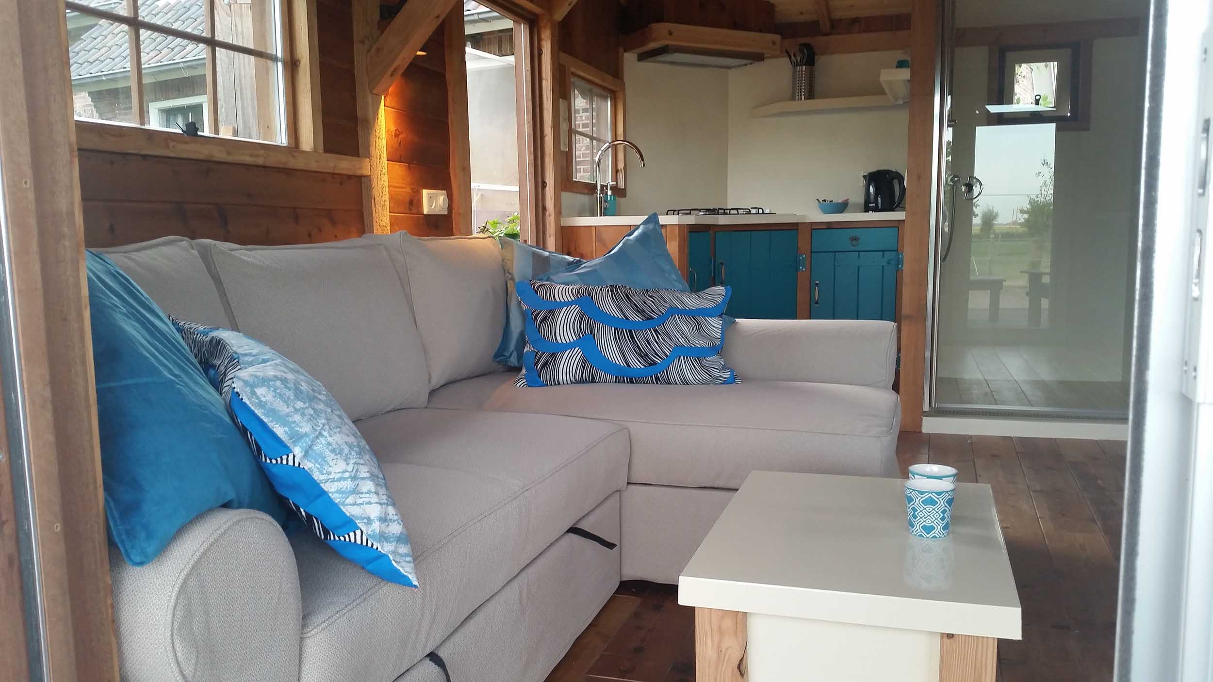 De mix van oude en nieuwe materialen, de frisse kleuren en openslaande deuren naar de overdekte veranda maken blokhut ’t Vroon tot een romantische GetAway.