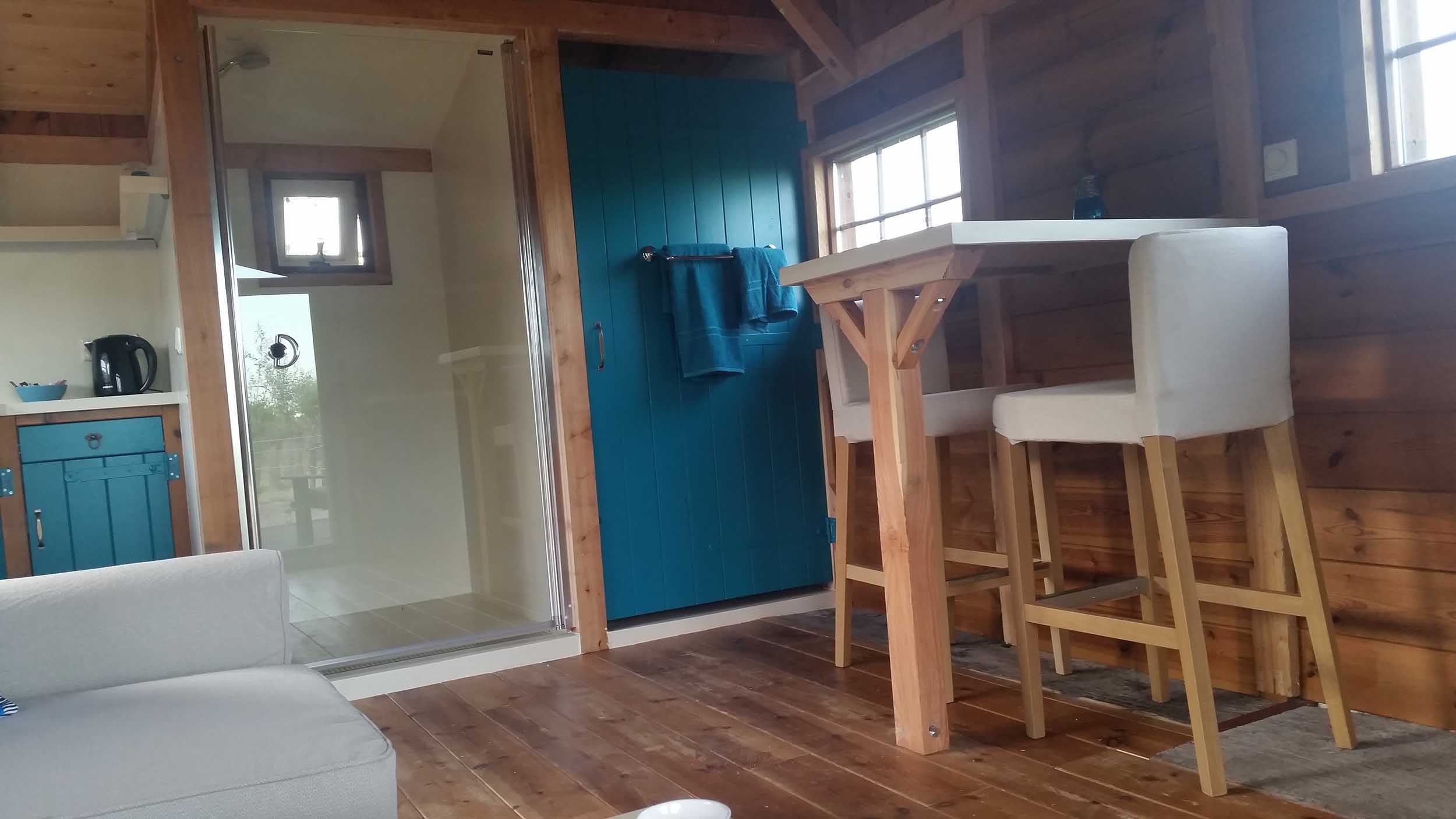 Voorzien van volledig ingerichte keukenhoek, riante douche, toilet, bartafel en slaapbank is ’t Vroon geschikt voor 2 personen. De veranda grenst aan de zandpaddock van de alpaca’s.