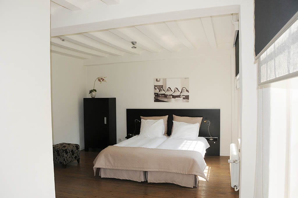 In de kamers heerst dezelfde sfeer als het slotklooster ademt, robuuste geschiedenis in een fris modern jasje. Dat begint al bij de kamerdeuren waarop de namen van de zusters prijken die ooit in het klooster verbleven.