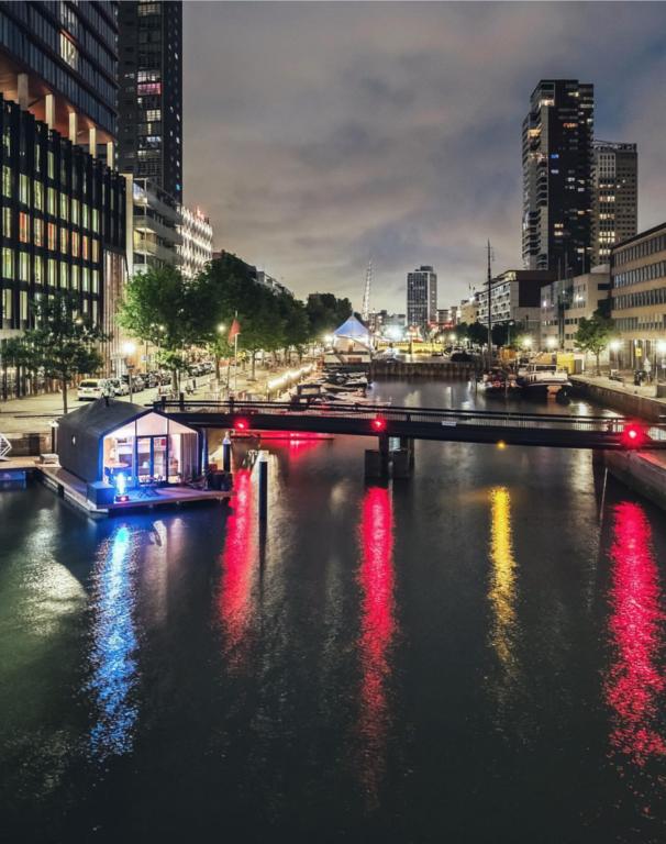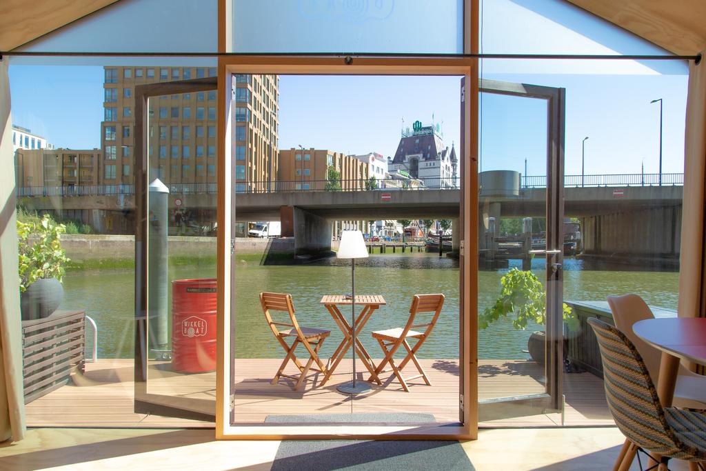 De Wikkelboat ligt in de Wijnhaven tussen de Rotterdamse hoogbouw. Op deze manier voelt een overnachting in de Wikkelboat écht een speciale ervaring.