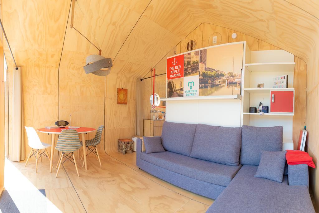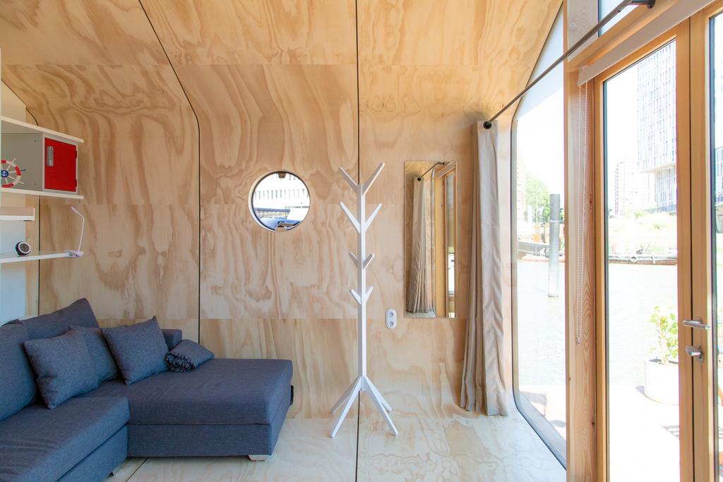 Deze tiny houseboat is dus duurzaam gemaakt en ingericht, met 24 lagen gerecycled goflkarton! Dit maakt deze woonboot niet alleen licht maar ook goed geïsoleerd qua geluid en temperatuur.