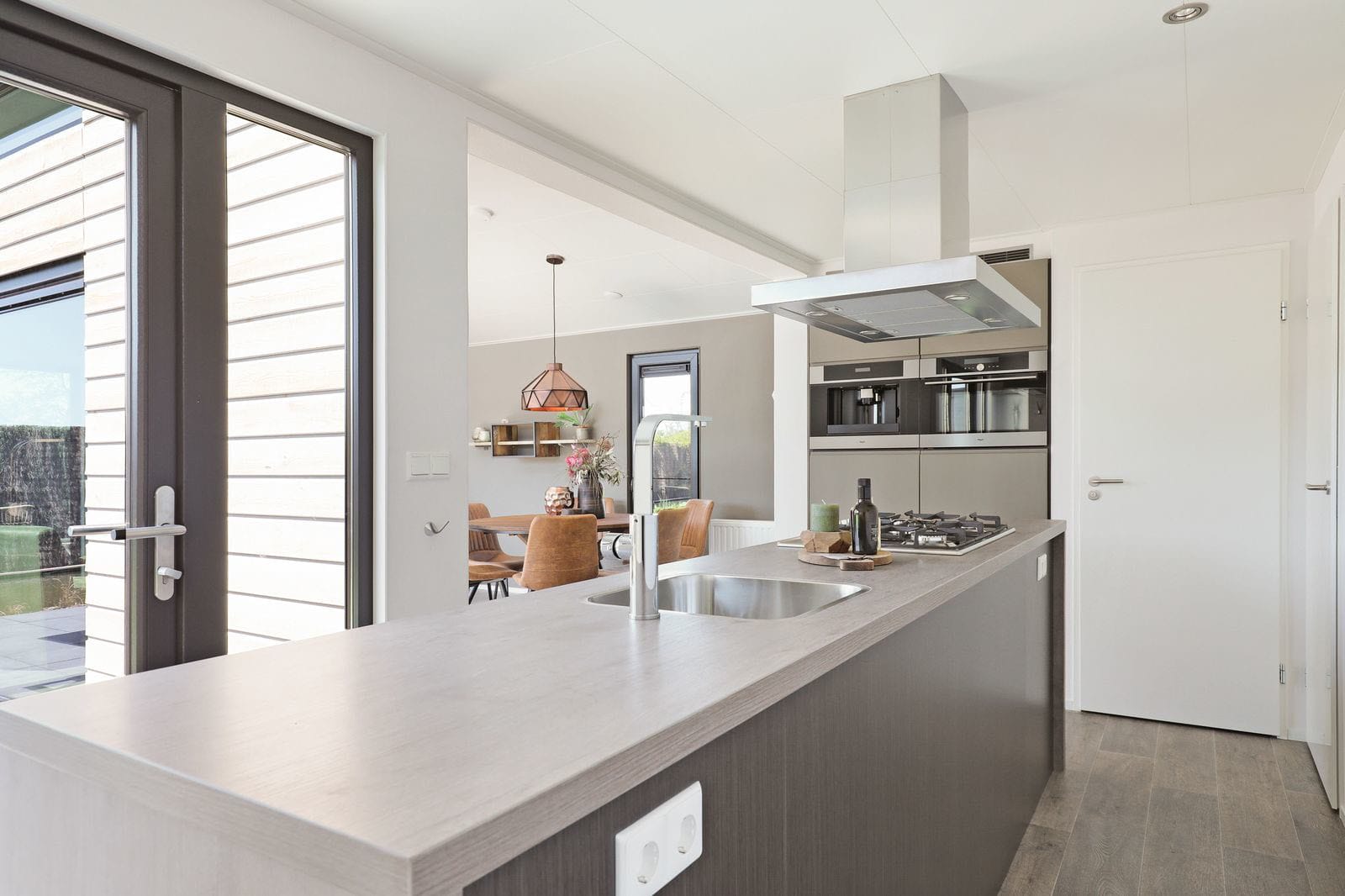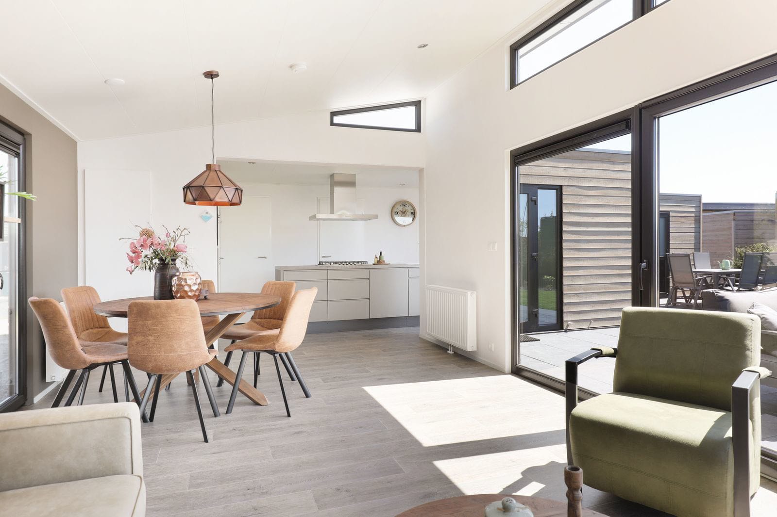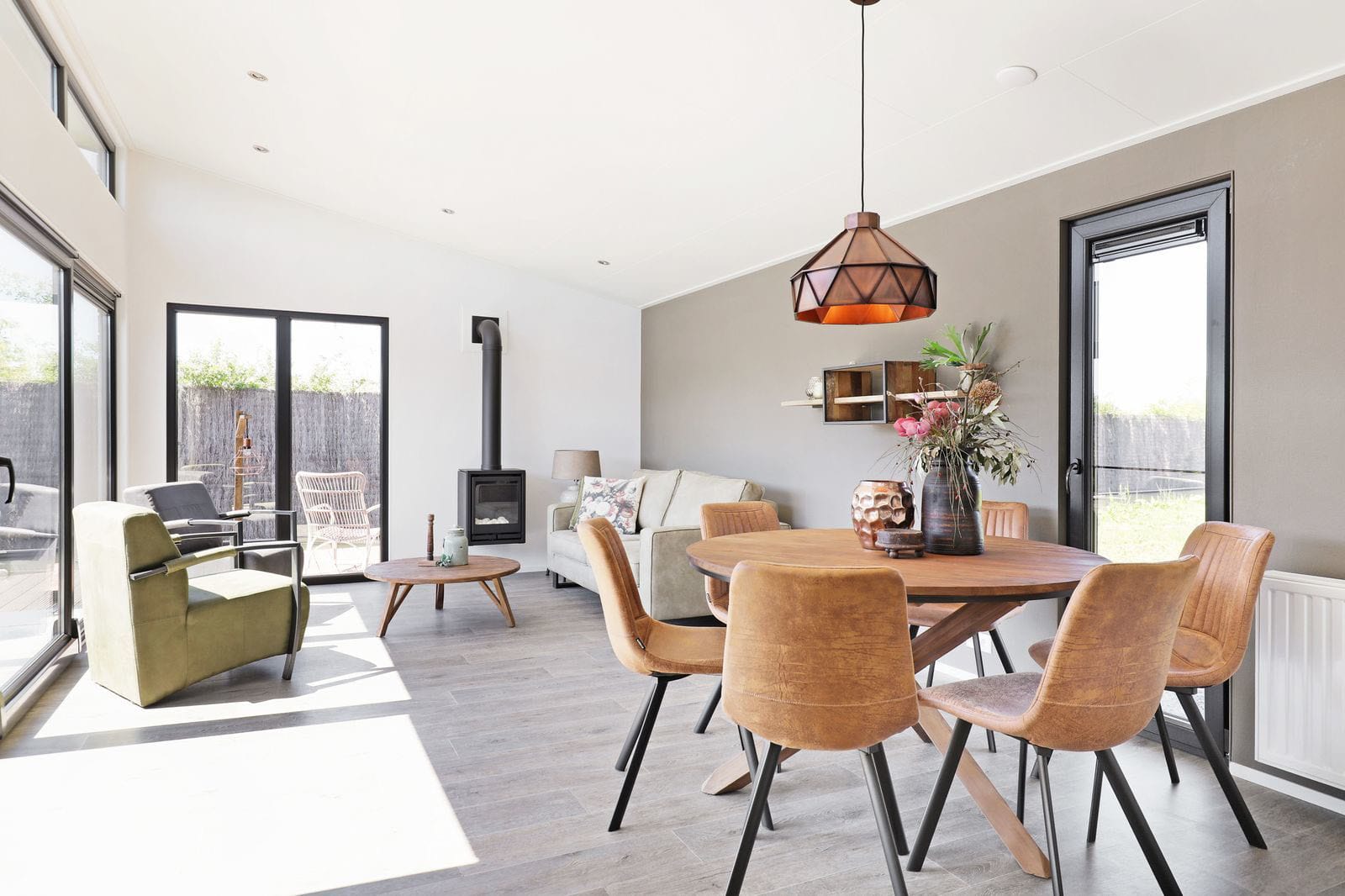Woonkamer met airco, sfeerhaard en een schuifpui naar het terras met loungeset. Compleet ingerichte open keuken voorzien van een kookeiland, vaatwasser, combi-magnetron en koffiemachine met verse bonen. Badkamer met douche, wastafel, apart toilet.